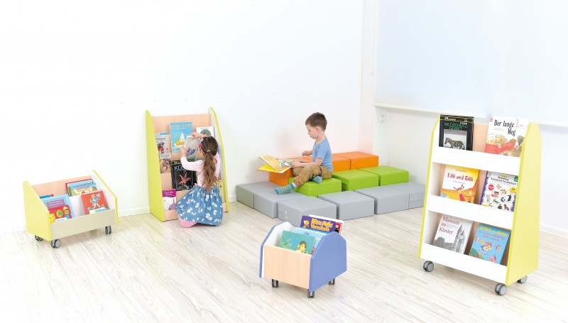 A bútorlapból készült gurulós könyvespolc mérete gyerekek magasságához lett kialakítva. A polc háromszögletes kialakítása lehetővé teszi, hogy mind a két oldalára lehessen könyveket vagy játékokat tenni. Oldalanként 3-3 tárolópolc található rajta. Alján lévő 4 kereke segít a könnyed mozgathatóságban. A polc két oldalsó lapja zöld színű, a test és a polcok előlapjai fehérek. A polc színes MDF bútorlapból és 1,8 cm-es laminált bútorlapból készül. Mérete: 90x38x98 cm, mélysége: 8/10/14 cm