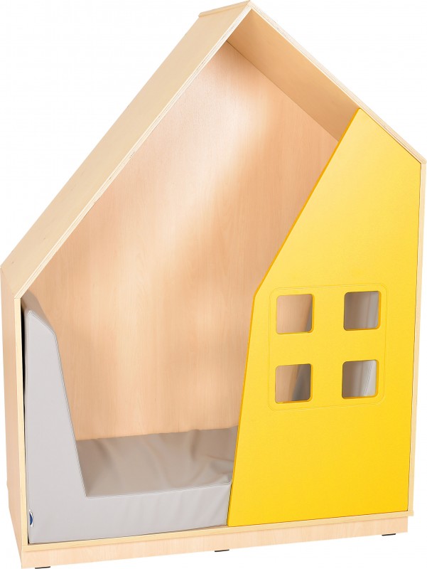A kuckózós házikó a gyerekek igényeit figyelembe véve lett kialakítva. Kis csúcsos, ház formájú alakja vidám külsőt kölcsönöz neki. A bútor teste natúr fa színű, takaró - kuckózós - lapja citromsárga, pici négyszögletes lyukakkal, amik az ablakot szimbolizálják. Belső részébe szürke vagy zöld matrac helyezhető, ezt a csomag nem tartalmazza. A házikó kompatibilis a termékcsalád további bútoraival. A házikó laminált, illetve MDF bútorlapból készült, a tető rétegelt lemez. Mérete: 130x60x173,5 cm Lapraszerelt termék.