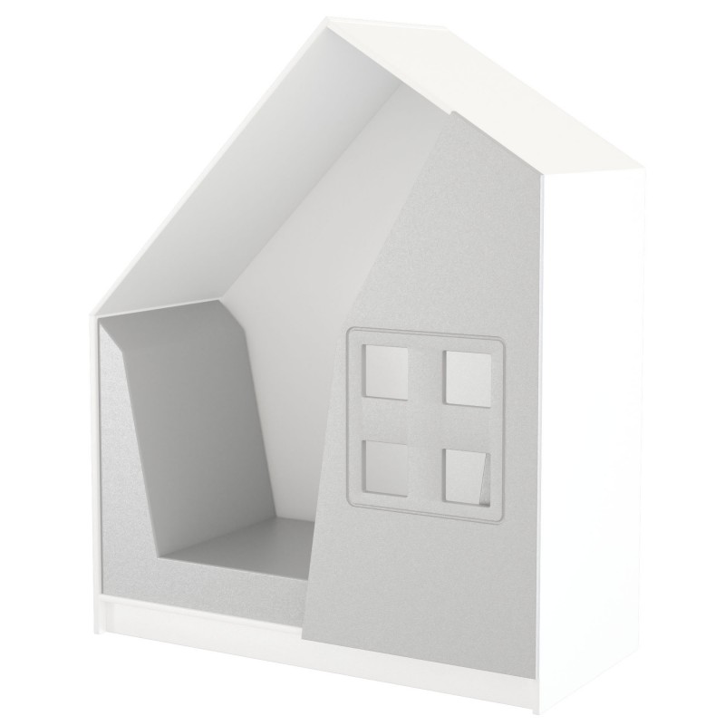 A kuckózós házikó a gyerekek igényeit figyelembe véve lett kialakítva. Kis csúcsos, ház formájú alakja vidám külsőt kölcsönöz neki. A bútor teste fehér színű, takaró - kuckózós - lapja szürke, pici négyszögletes lyukakkal, amik az ablakot szimbolizálják. Belső részébe szürke vagy zöld matrac helyezhető, ezt a csomag nem tartalmazza. A házikó kompatibilis a termékcsalád további bútoraival. A házikó laminált, illetve MDF bútorlapból készült, a tető rétegelt lemez. Mérete: 130x60x173,5 cm Lapraszerelt termék.