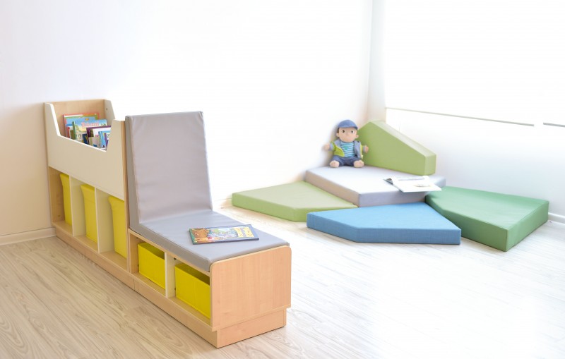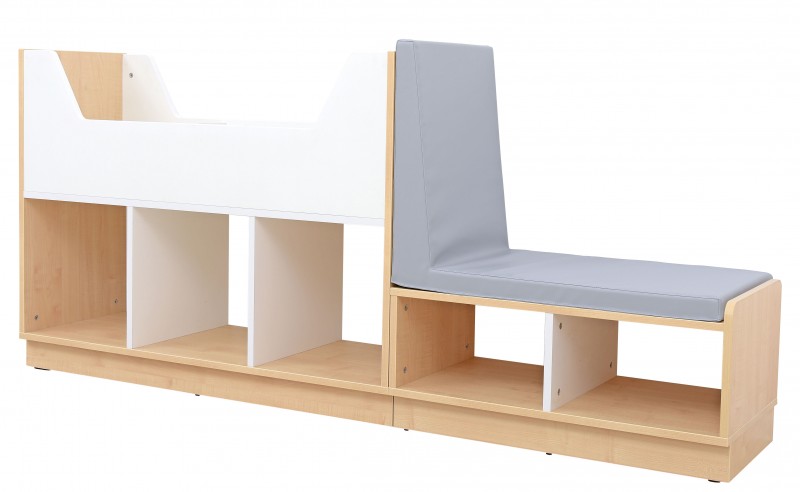 A polcos pihenő térelválasztó tárolóként és kényelmes pihenőhelyként is használható. Lekerekített sarkai és műbőrrel bevont matraca biztonságos és komfortos kialakítást nyújt. Lapraszerelt kivitelben érkezik, méretei: tárolópolc 117×41,5×88 cm, pihenőelem 79×41,5×68 cm. Praktikus, strapabíró, lapraszerelt bútor, amely ideális gyerekszobába vagy közösségi térbe.