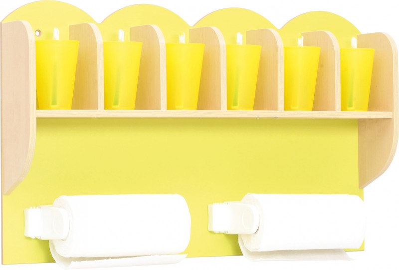 A színes fürdőszobai pohár és papírtörlő tartóra 6 db pohár és 2 guriga papírtörlő helyezhető. A polc hátlapja citromsárga, a pohártartó polc és az elválasztók juhar színűek. A lapok 1,8 cm szélesek. A hátlap teteje kis hullámvonalban megvágott, így játékos megjelenést biztosít számára. A polc sarkai lekerekítettek, anyaga laminált és MDF bútorlap. A papírtörlő tartók fehér színű műanyagból készültek. A termék mérete: 76x12,5x46,5 cm, pohártartó mérete: 12x12x15 cm, papírtörlő tartó szélessége: 23-31 cm