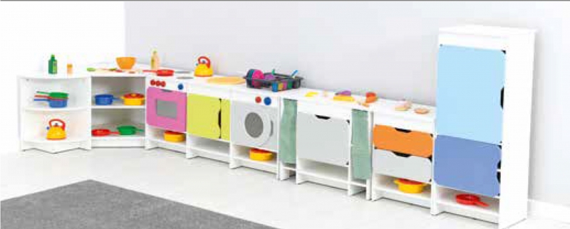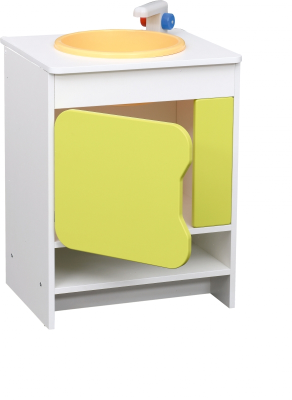 A modul 12 mm vastag, fehér laminált lapból, az előlap pedig színes MDF lapból készült. A tetején egy sárga, kör alakú mosogató medence (sárga műanyag) található csapteleppel, valamint 1 piros (melegvíz), és egy kék (hidegvíz) gomb is. A mosogatószekrény ajtaja kinyitható. - mérete: 53x39,2x34 a mosogató medence átmérője: 24 cm, - szekrény belső mérete 36,6x28,4x33 cm, - polcok 36,6x29,8x8 cm. Lapra szerelten szállítjuk!
