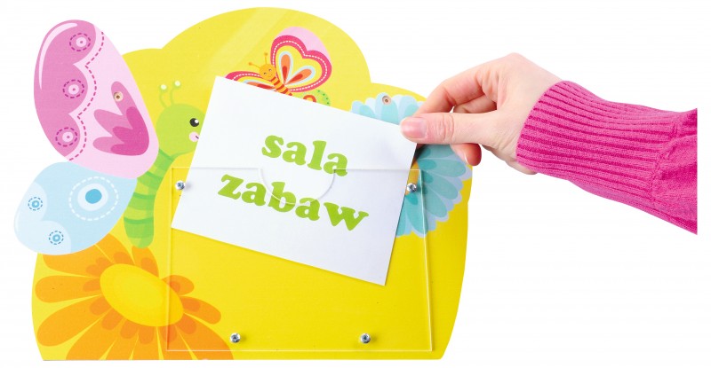 Színes tábla, aranyos és vicces alakzatban, amit a falra tudunk akasztani. A táblán van egy kis tartó amibe bármilyen szöveget beletudunk tenni, akár nevünket, vagy a csoport nevét. A plexi üveg mérete A6. Szuper kiegészítője a szobának.