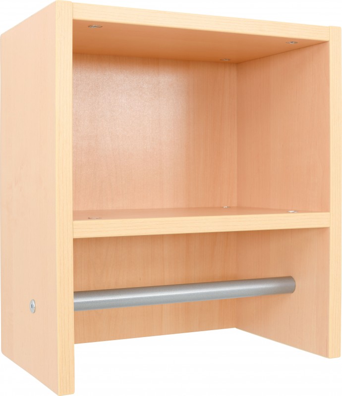 A fali polc alumínium rúdjára könnyedén ráilleszthető a rekeszes textiltároló, így kiváló kiegészítője lesz csoportszobáknak. Alumínium rúddal. Mérete: 35x22x40 cm Felső rész mérete: 31,5x21,5x20 cm, anyaga: laminált bútorlap (1,8 cm)
