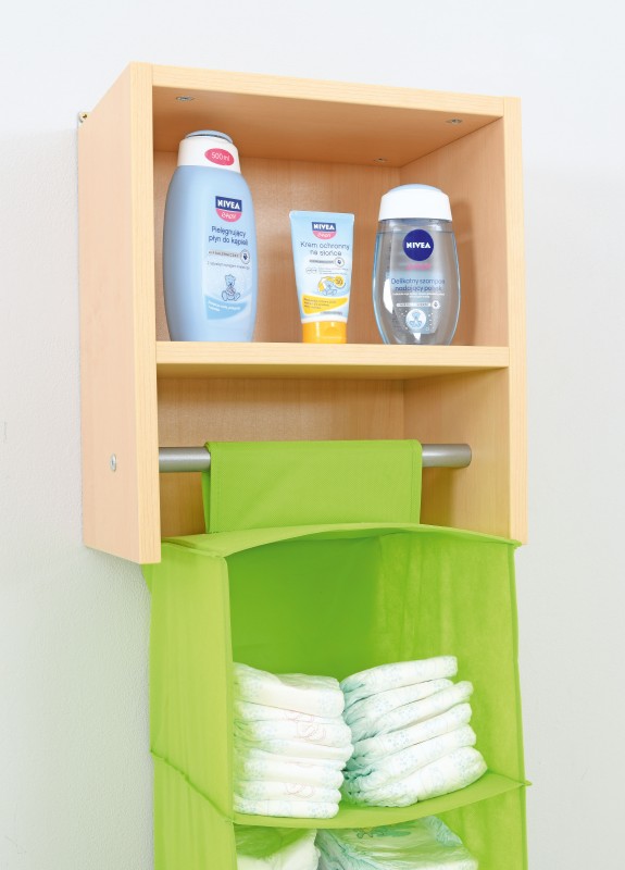 A fali polc alumínium rúdjára könnyedén ráilleszthető a rekeszes textiltároló, így kiváló kiegészítője lesz csoportszobáknak.