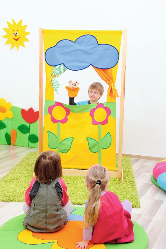 Az időjárás tematikájú bábszínház ideális térelválasztónak is. A natúr fa keretre egy citromsárga színű textil színházat lehet kifeszíteni. A színházat az időjárás témája ihlette, citromsárga alapháttere előtt két rózsaszín szirmű, zöld, leveles szárú virág látható. Felső részén egy kék felhő van, melyből egy narancssárga és egy zöld-fehér csíkos függöny lóg le. A termék színei élénkek és figyelemfelkeltőek. A felhő alatti nyíláson keresztül elbábozható számos mese és történet. Mérete: 92x40x154 cm Lapraszerelt termék.