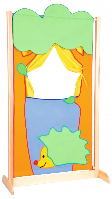 Az erdő tematikájú bábszínház ideális térelválasztónak is. A natúr fa keretre egy erdei képet ábrázoló textil színházat lehet kifeszíteni. A színházat az erdő témája ihlette, kék alapháttere előtt két narancsos-barna fatörzs és egy zöld testű, sárga fejű süni látható. Felső részén a zöld színű lomb van, melyből egy citromsárga függöny lóg le. A termék színei élénkek és figyelemfelkeltőek. A süni arca barátságos, kis fekete szemei, mosolyra húzott szája és piros orrocskája van. A lomb alatti nyíláson keresztül elbábozható számos mese és történet. Mérete: 92x40x154 cm Lapraszerelt termék.