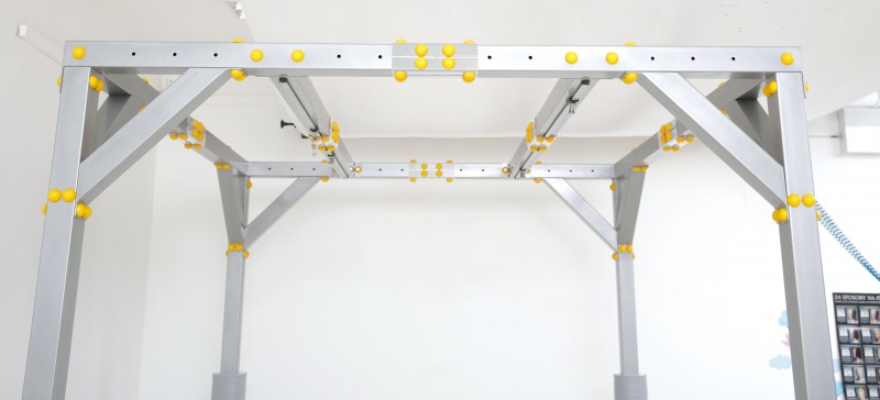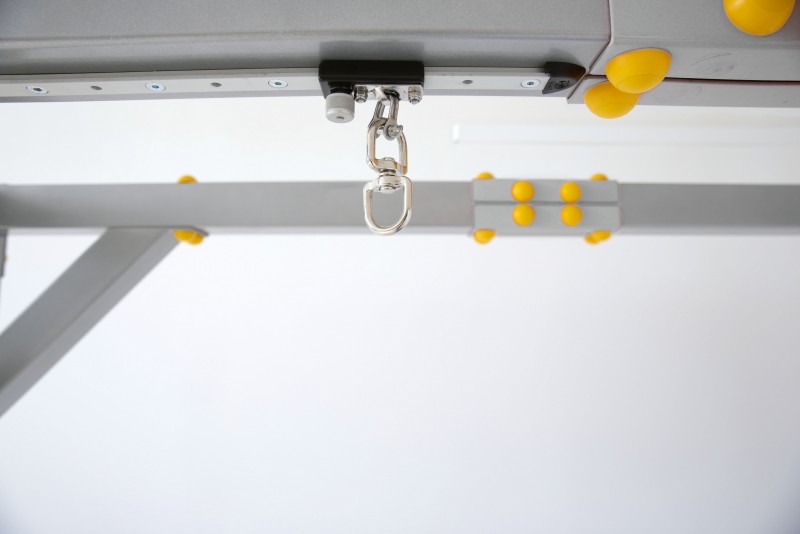 A két mozgatható gerenda vezetős kocsikkal és karabinerekkel van felszerelve, így számos fejlesztő eszköz könnyen és biztonságosan rögzíthető.