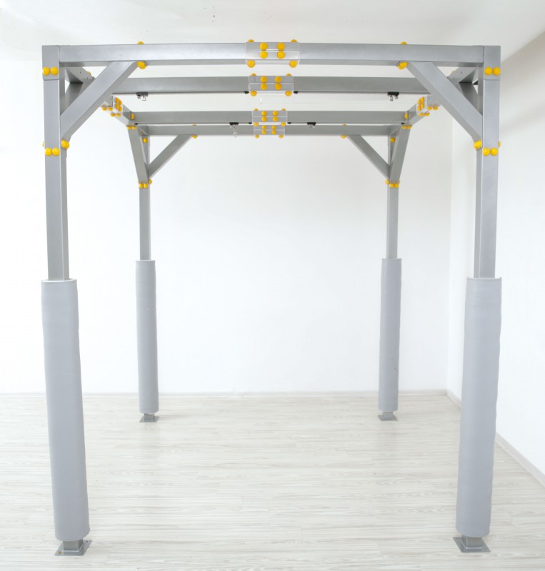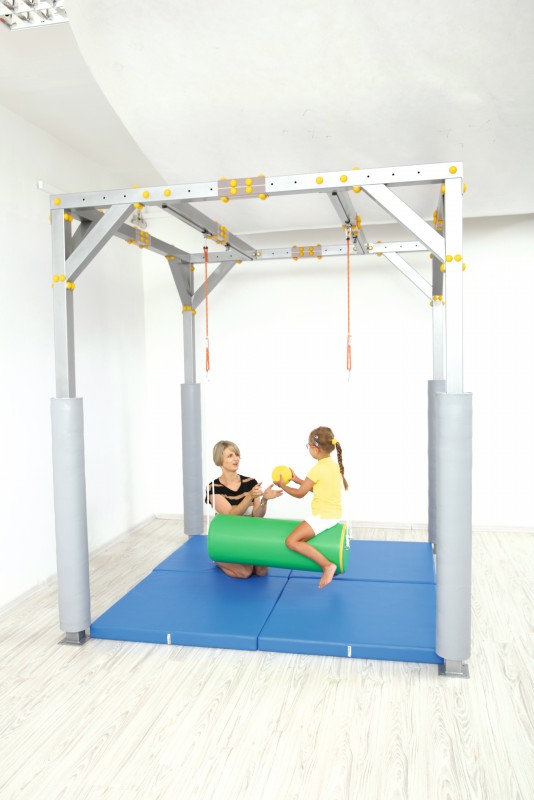 A Mozgásfejlesztő terápiás kabin (220x220x250 cm) stabil fémszerkezete biztonságos alapot nyújt a szenzoros terápiás eszközök használatához. Két mozgatható gerendája kocsikkal és karabinerekkel biztosítja a változatos fejlesztő eszközök rögzítését. PVC szövet borításának köszönhetően tartós, könnyen tisztítható és kiemelten előnyös a hosszú távú, intenzív használatra.