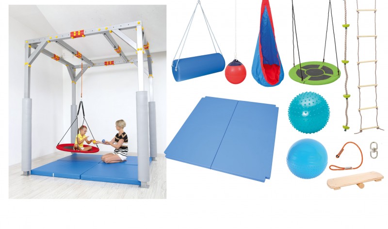 A mozgásfejlesztő terápiás kabinhoz az alábbi kiegészítők tartoznak: matrac szett, szivacs hengerhinta, fészekhinta, érzékelő labda- 20 cm, Terápiás érzékelő labda- 55 cm-es (fele sima- fele tüskés) csepphinta, kötéllétra, egyensúlydeszka, mászókötél, függeszthető terápiás labda, gumikötél, forgóhorog