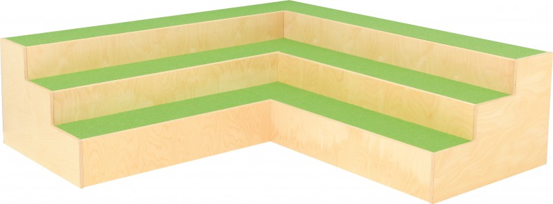 A lépcsős pihenő sarok (lépcsőfok magassága: 20–35 cm) kényelmes és biztonságos ülőhelyet biztosít a gyerekeknek. Masszív, csúszásgátló borítással ellátott kialakítása hosszú távon is megbízható. Előnyös, mert pihenőként, közösségi térként és mesesarokként is használható.