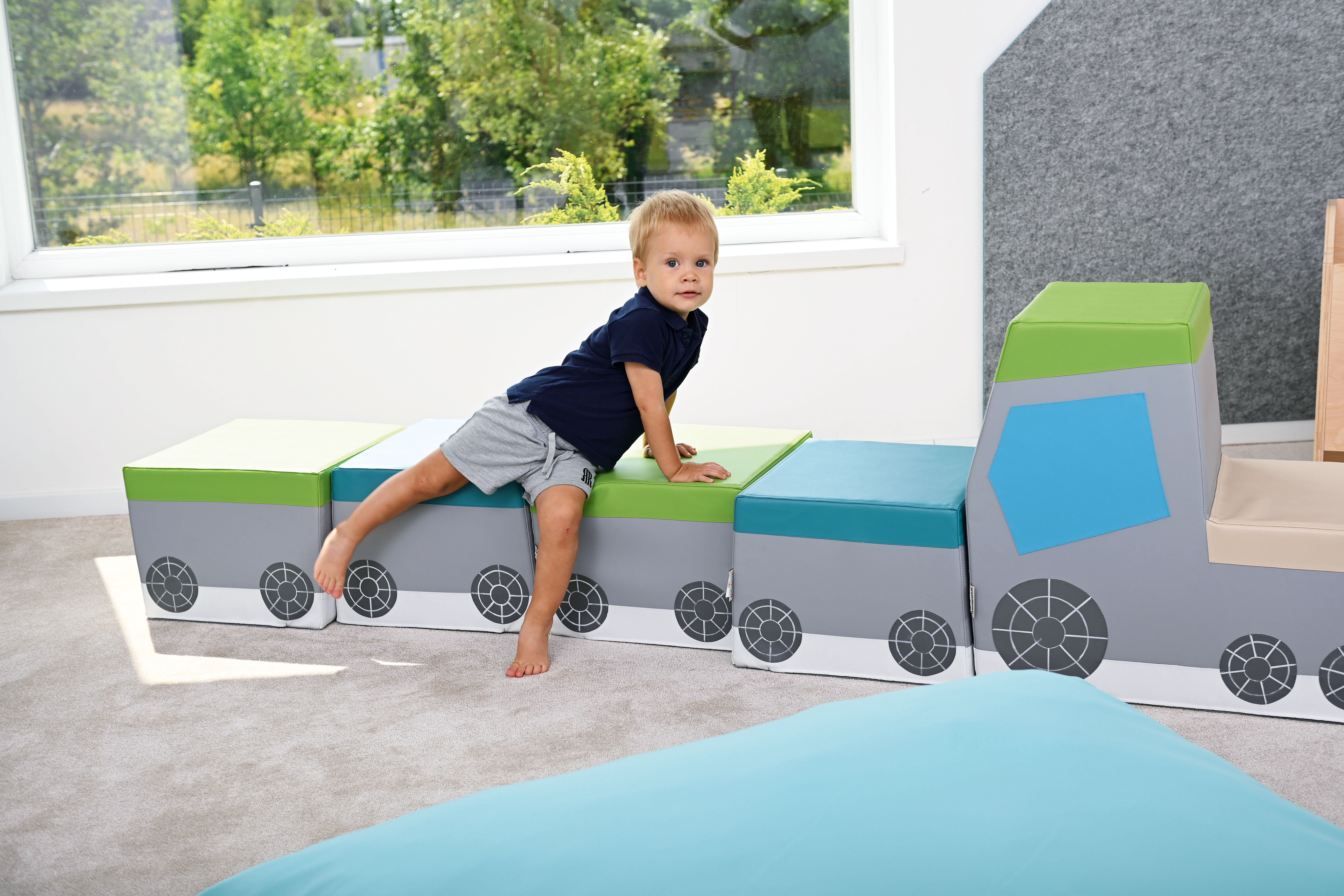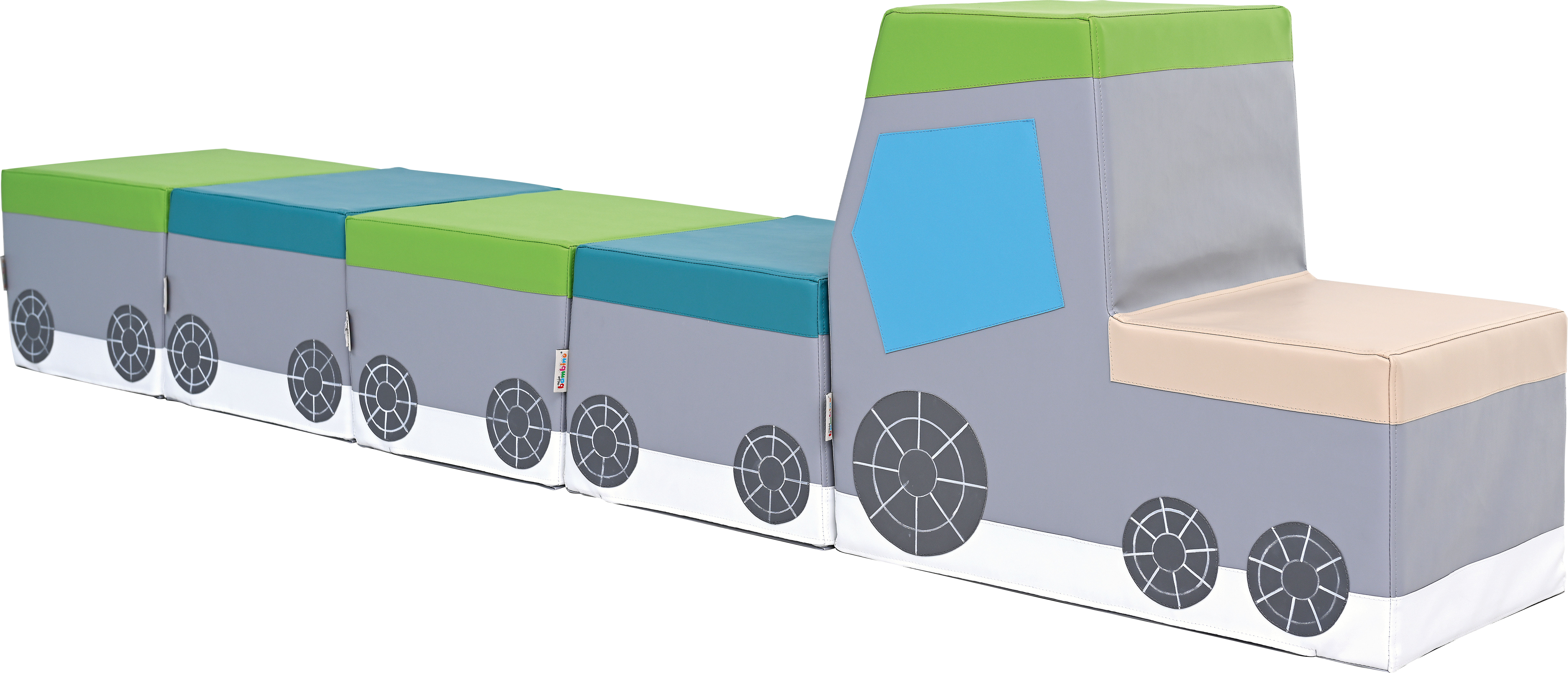 Vonat puhasarok - 6 db műbőrrel bevont szivacsmodulból áll - 3 db konkáv szivacselem: 40x40x25 cm - 2 db konvex szivacselem: 40x50x28 cm - 1 db mozdony szivacselem: 40x50x58 cm - Összeállított hossza: 250 cm - Az elemek tartós, ftalátmentes, könnyen tisztítható PVC bevonattal rendelkeznek - Leírás: Puha, variálható szivacs modulrendszer vonat formában, amely ülésre, mozgásfejlesztésre és játékra is alkalmas. - Fejlesztési terület: nagymozgás, egyensúly, koordináció, testtudat, térbeli tájékozódás, szociális készségek