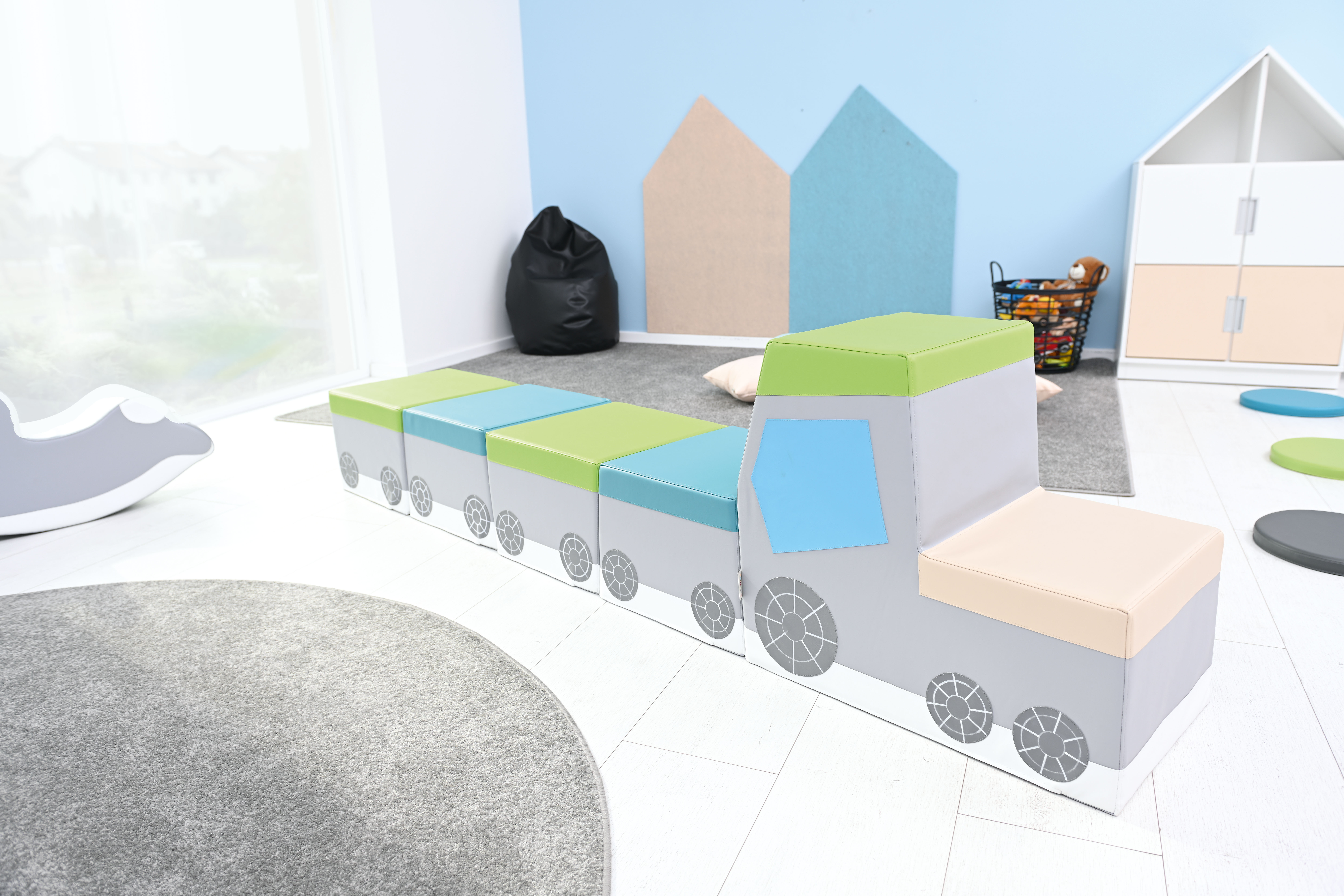 Vonat puhasarok egy több elemből álló, habszivacs alapú mozgásfejlesztő és ülőbútor készlet.