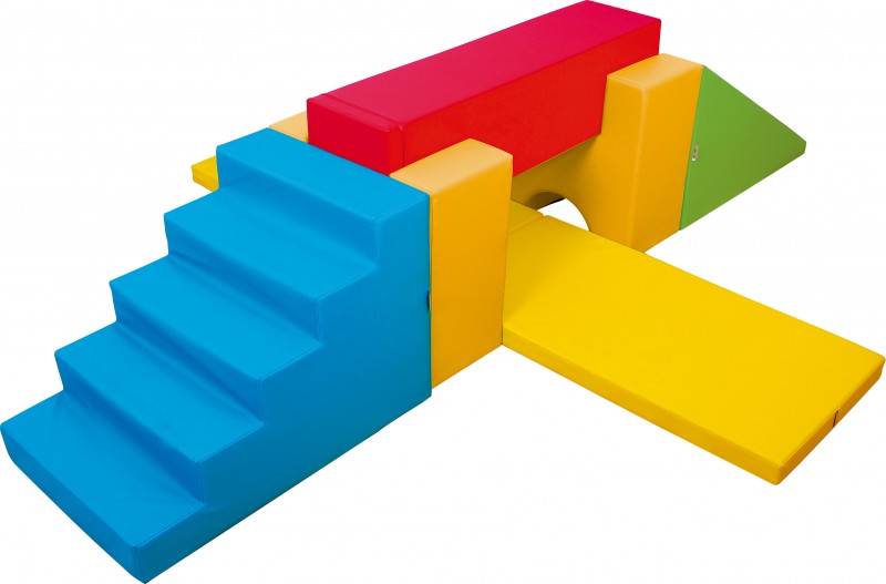 A modulszett az alábbi elemeket tartalmazza: - 1 db Lépcsőelem 90x60x60 cm - 2 db Multifunkciós elem - 1 db Gerenda elem 120x30x30 cm - 1 db csúszda elem 90x60x60 cm - 2 db matrac 60x120x7 cm, teljes méret összeállítva: 240x300 cm, anyaga: műbőrrel bevont habszivacs. 12 hónapos korú gyermekek használatára CE minősítéssel ellátva!