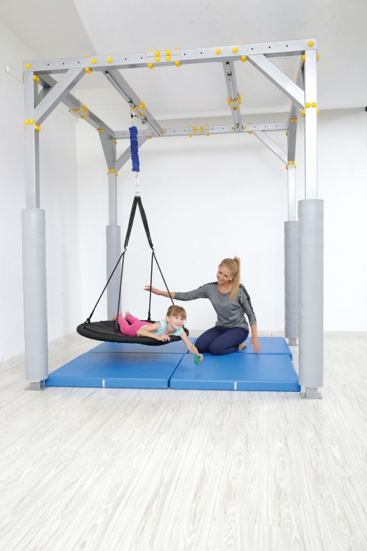 A fészekhinta óvodáknak és iskoláknak is ajánlott. Egyszerre több gyermek egyidejű hintázását biztosítja. A hinta pereme durvább, erős szövésű anyaggal bevont. Külön megvásárolható forgószem segítségével a hinta nem csak egy adott síkban történő mozgásra alkalmas, hanem a tengelye körüli forgásra is. Gyógy- és fejlesztőtornákhoz is alkalmazható kiegészítő. A Terápiás kabinethez rögzíthető! 3 éves kortól ajánlott! Átmérője: 100 cm Magasság: 180 cm Terhelhetőség: maximum 70 kg Magassága állítható.