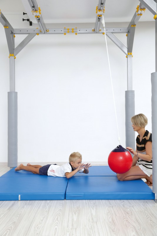 A labda kiválóan alkalmazható reflex gyakorlatok fejlesztéséhez. A gyermek vagy a hasán fekszik és maga előtt tolja a labdát vagy a hátán fekszik és a terapeuta tolja a labdát az irányába.