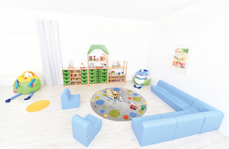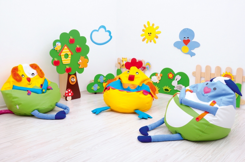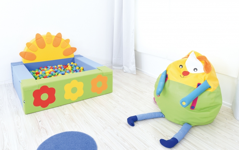 Különböző textúrájú textilek és műbőr felületek serkentik a gyerekek érzékszerveit, miközben élénk színei – zöld, kék, sárga és rózsaszín – vidámságot sugároznak.