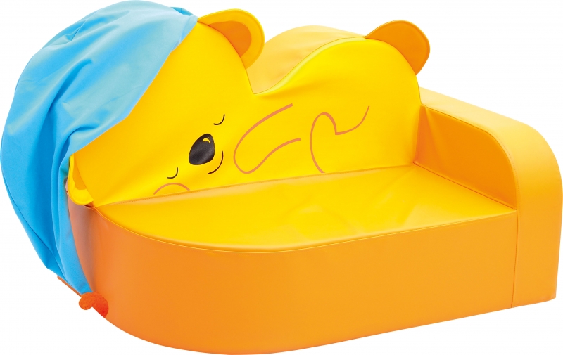 A kis kanapé színei élénkek, az ülőfelület és a karfa narancssárga, a mackó citromsárga, a kis alvósapka pedig babakék színű. A kanapé külső borítása ftalátmentes műbőr, belső töltete habszivacs. A huzat anyagának köszönhetően könnyedén tisztítható. A kis sapka tépőzárral rögzíthető. Mérete: 102x56x62 cm Ülőmagassága: 22 cm