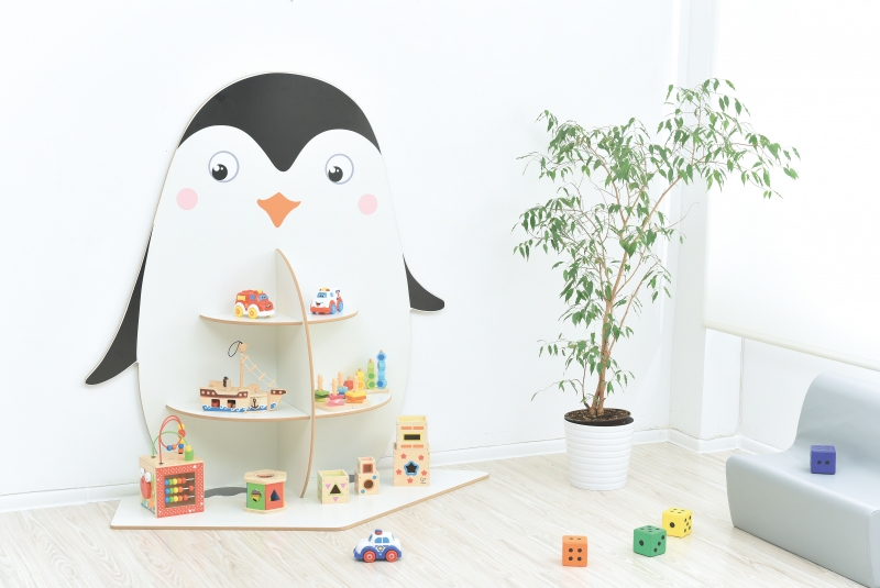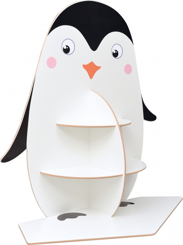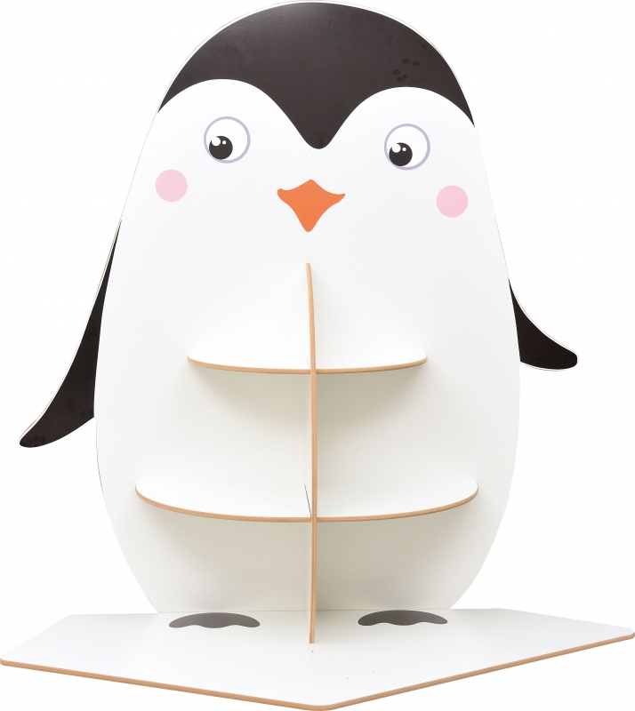 Pingvin formájú tárolópolc, rétegelt falemezből. 2 db 2-2 részre osztott polccal felszerelve könyvek, és játékok számára.