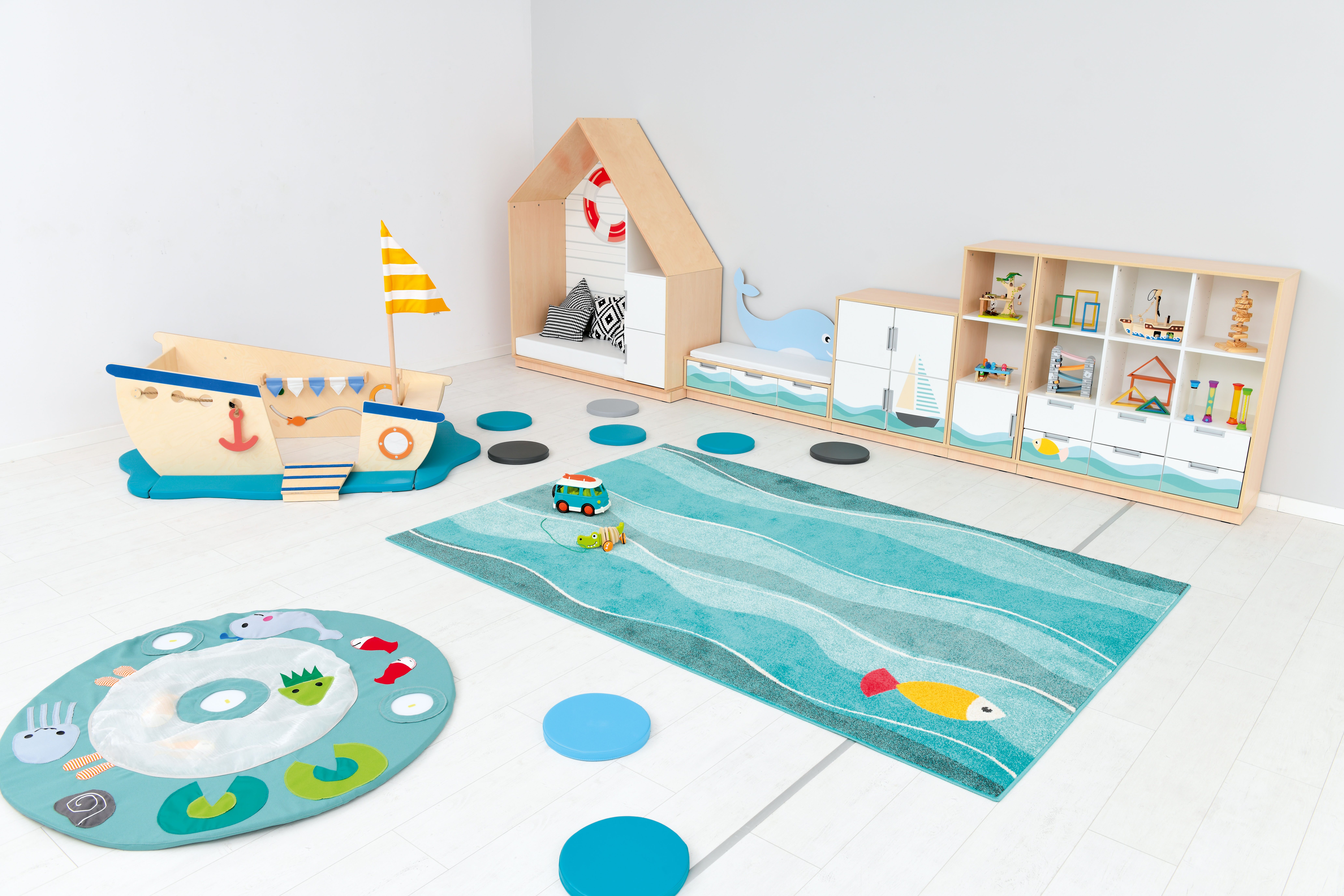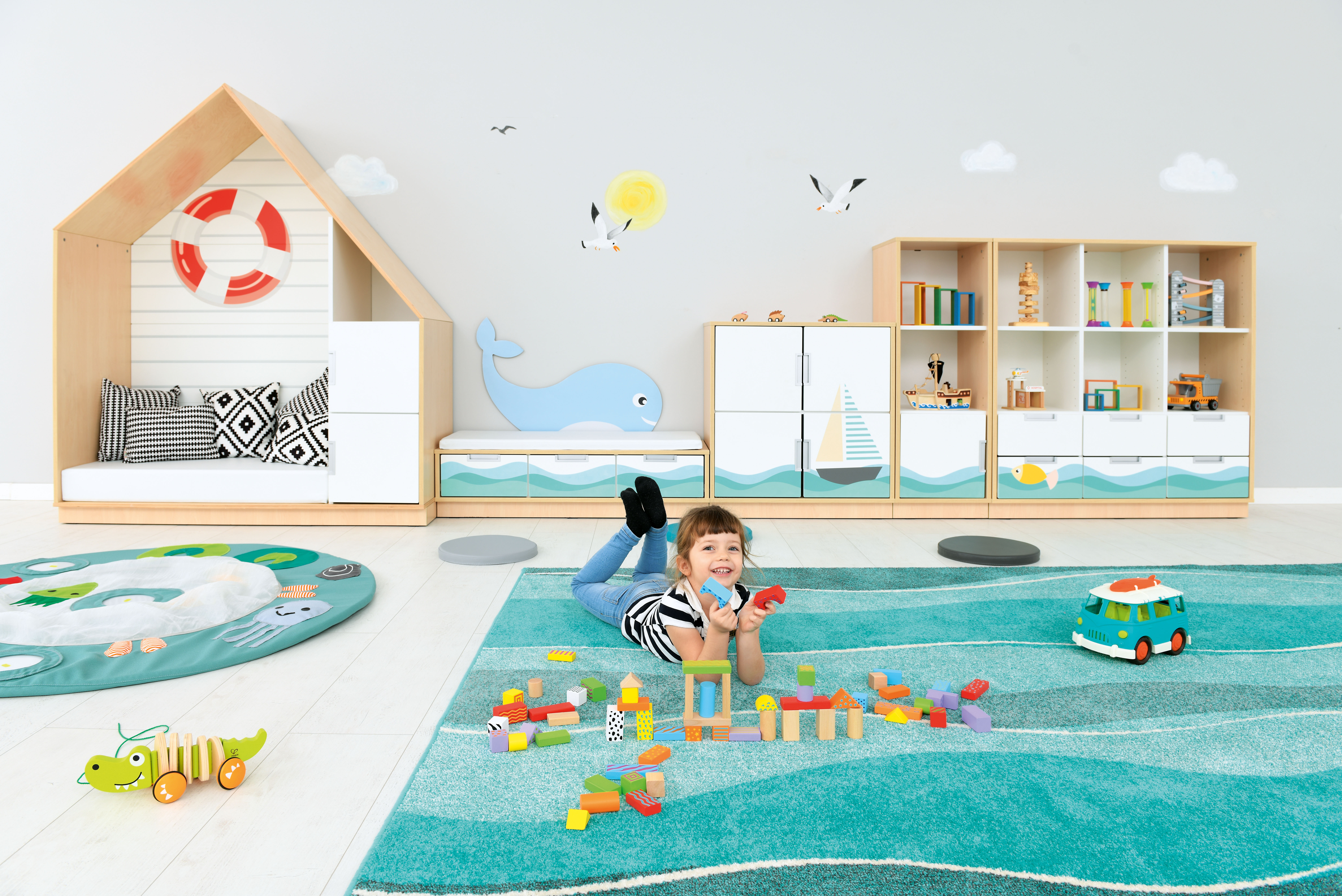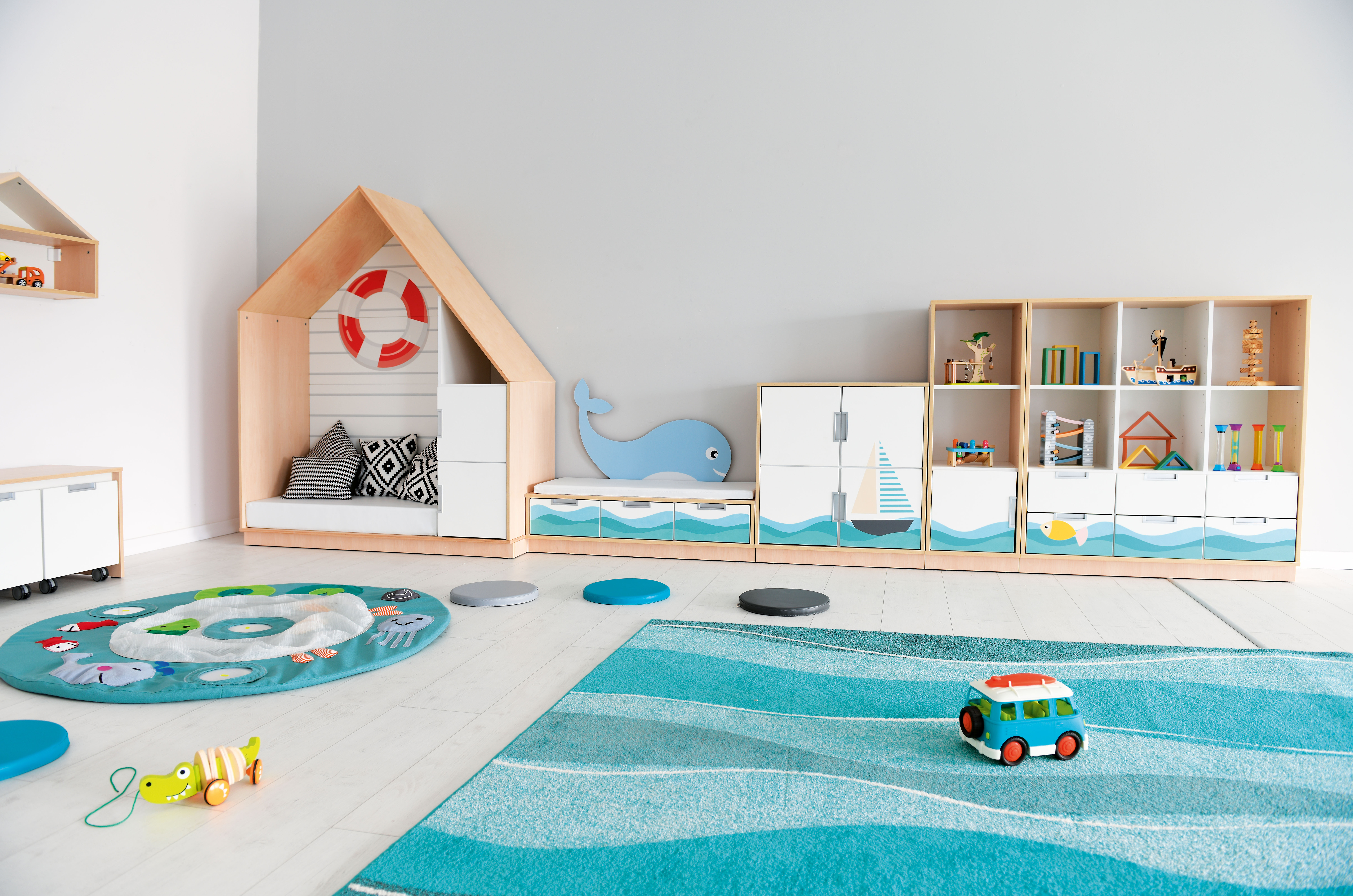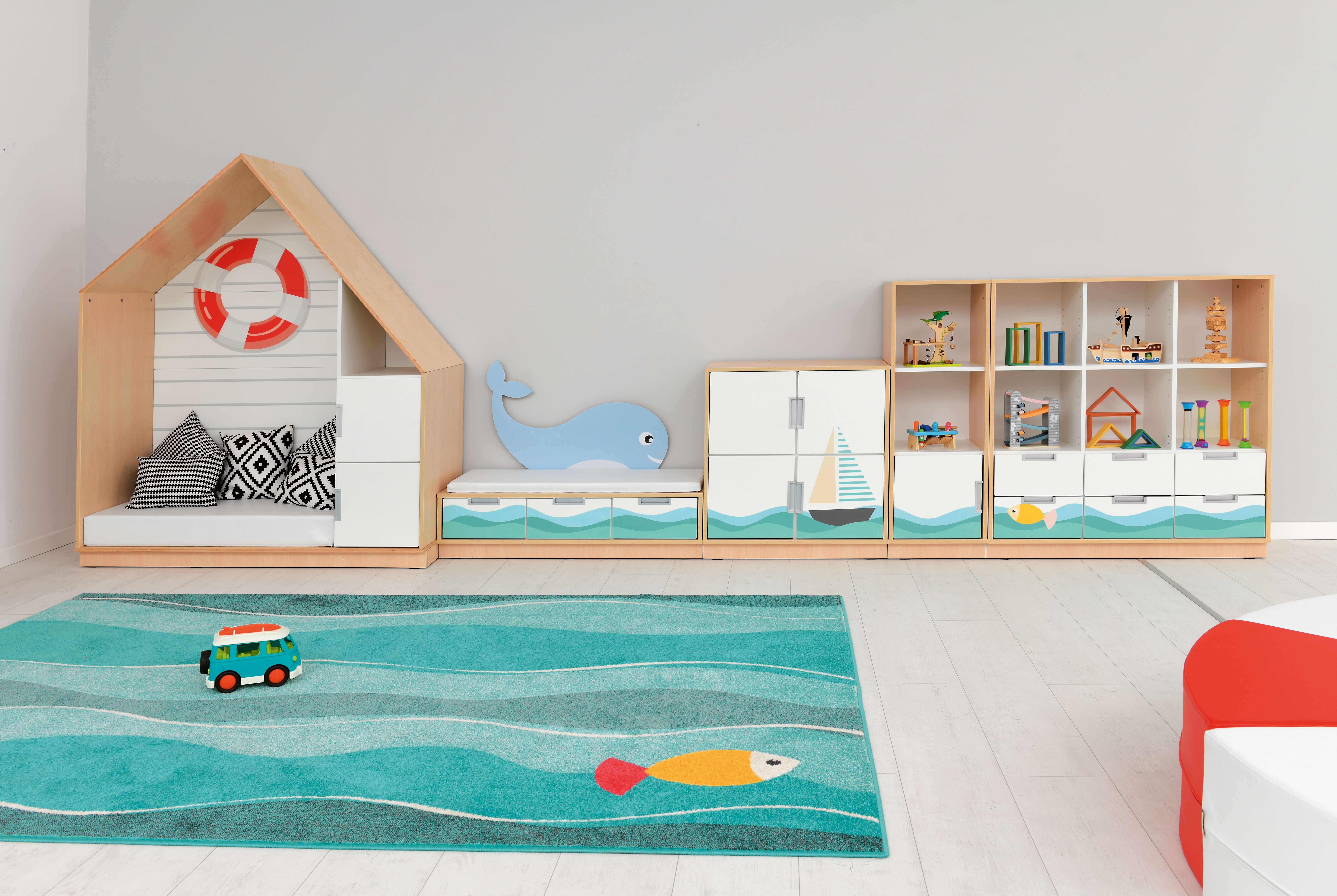 A tenger mintás szekrénysor játékos, gyermekbarát motívumaival barátságos és inspiráló környezetet teremt.