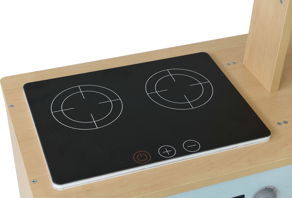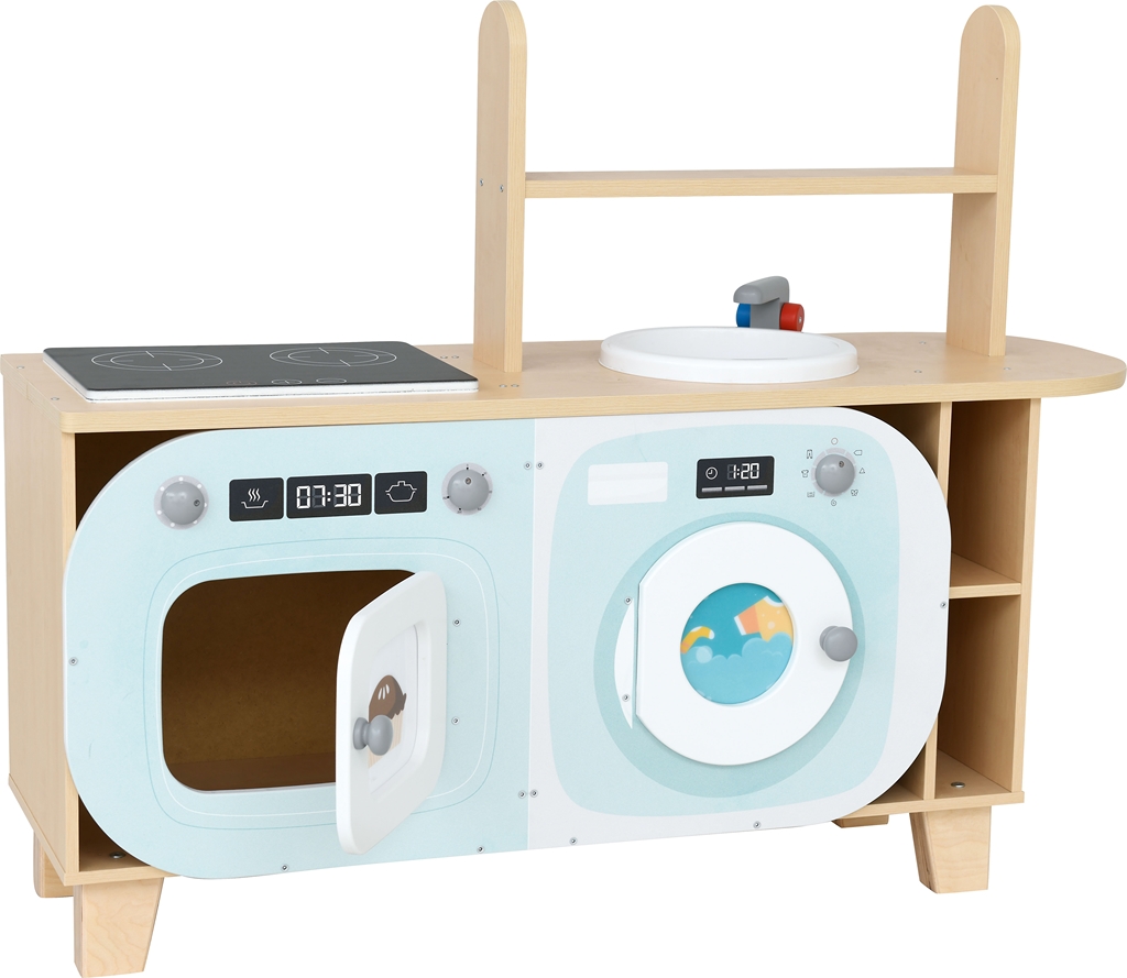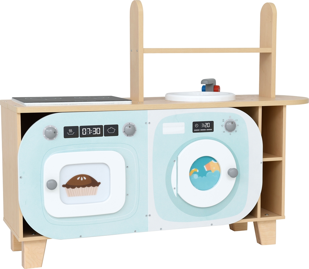 A 123x36x90 cm-es kiskonyha alsó szekrényei többfunkciósan használhatók: sütőként, mikrohullámú sütőként, mosógépként vagy akár hűtőként is.