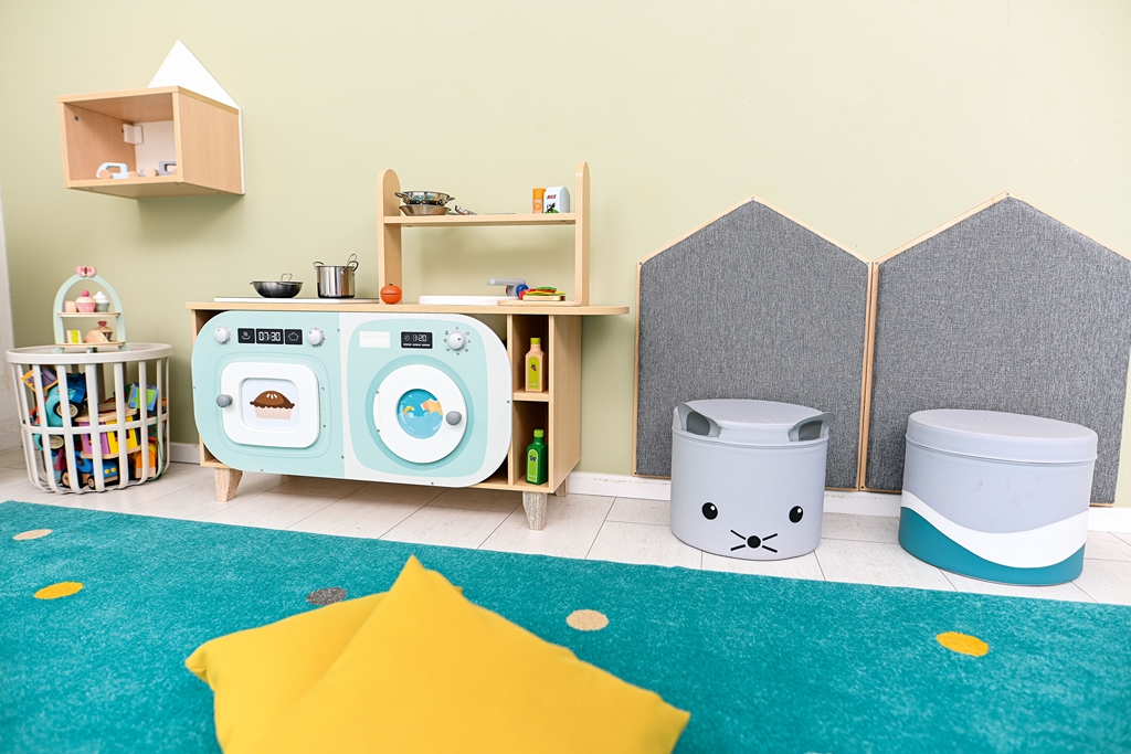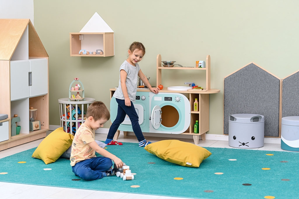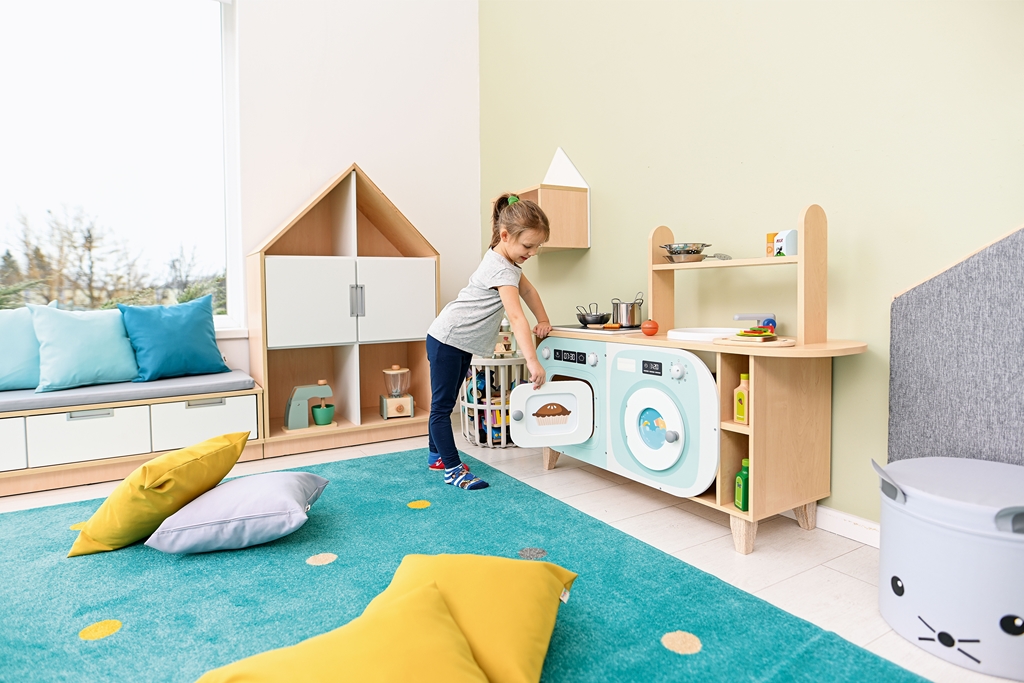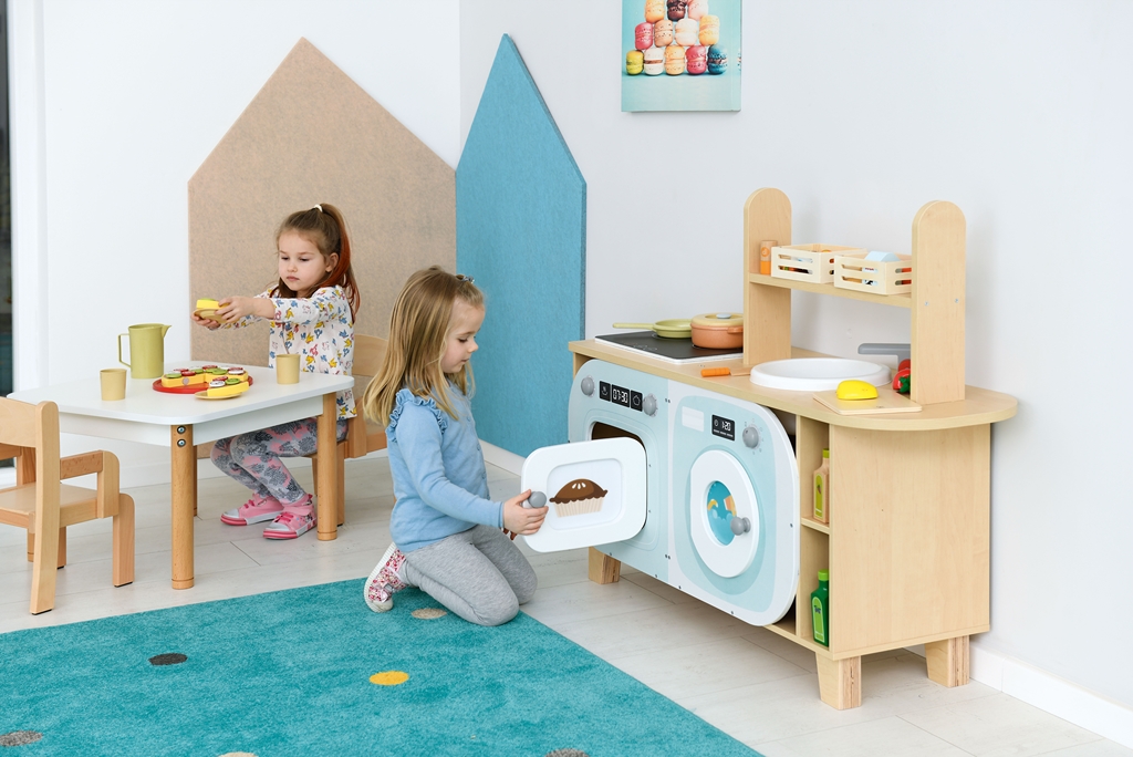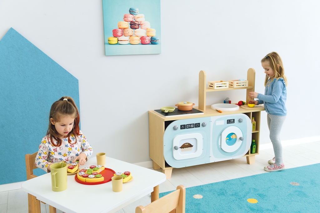 A Vidám konyhasziget egy sokoldalú, biztonságos és tartós szerepjáték bútordarab, amely ösztönzi a gyerekek kreativitását.A 123x36x90 cm méretű kiskonyha többfunkciós szekrényekkel, főzőlappal és mosogatóval teszi változatossá a játékot.Előnye, hogy könnyen tisztán tartható és biztonságos kialakítású, így ideális óvodai és otthoni használatra is.