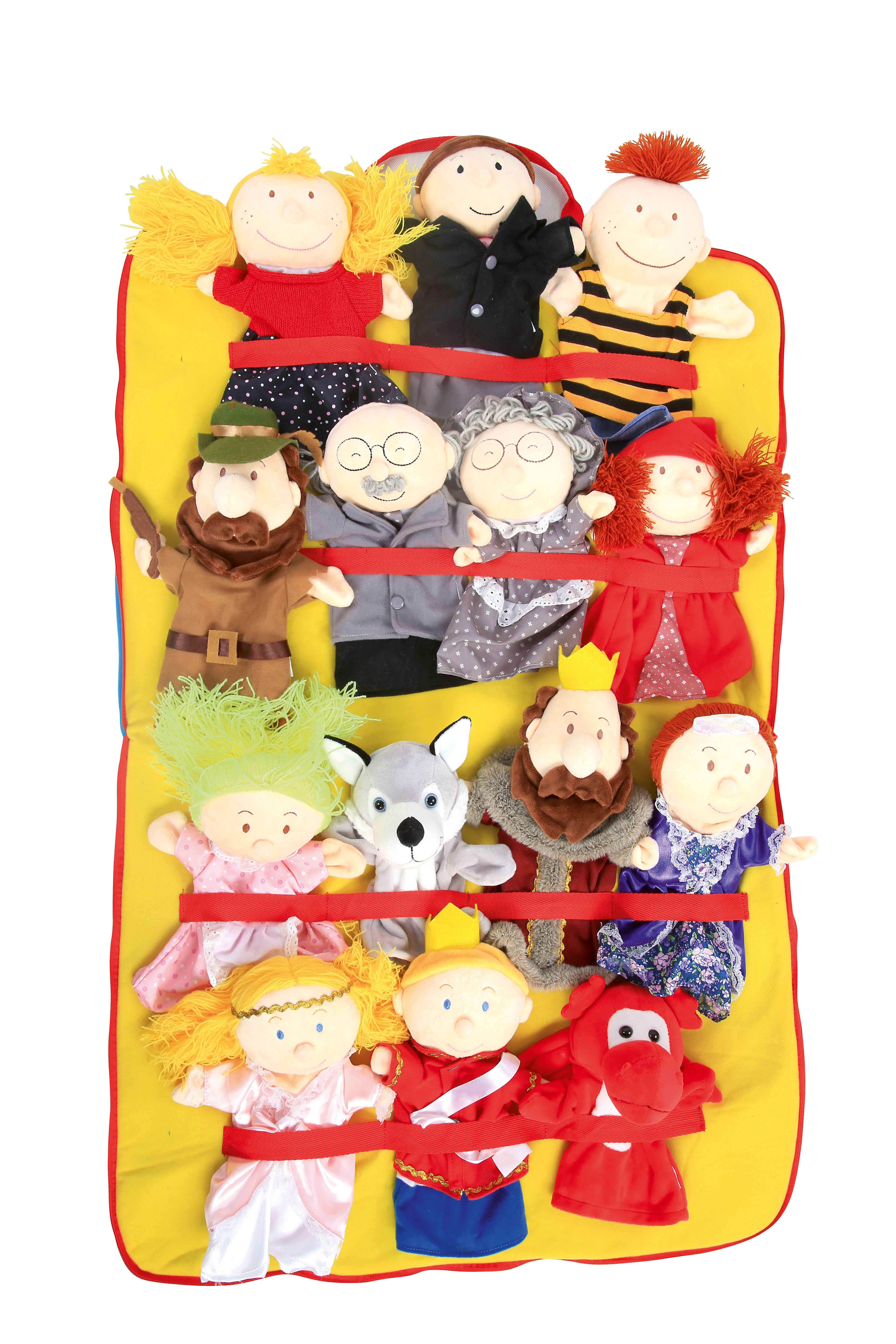 Kivitel: óvodai bábkészlet hordozható táskával Anyag: szövet Bábuk száma: 14 db Bábuk magassága: 22–30 cm Zárt táska mérete: 63x48 cm Nyitott táska mérete: 63x96 cm Tárolás: cipzáras, hordozható táska Ajánlott korosztály: 3 éves kortól Figyelmeztetés: 3 év alatti gyermekek számára nem alkalmas, fulladásveszély – apró alkatrészek