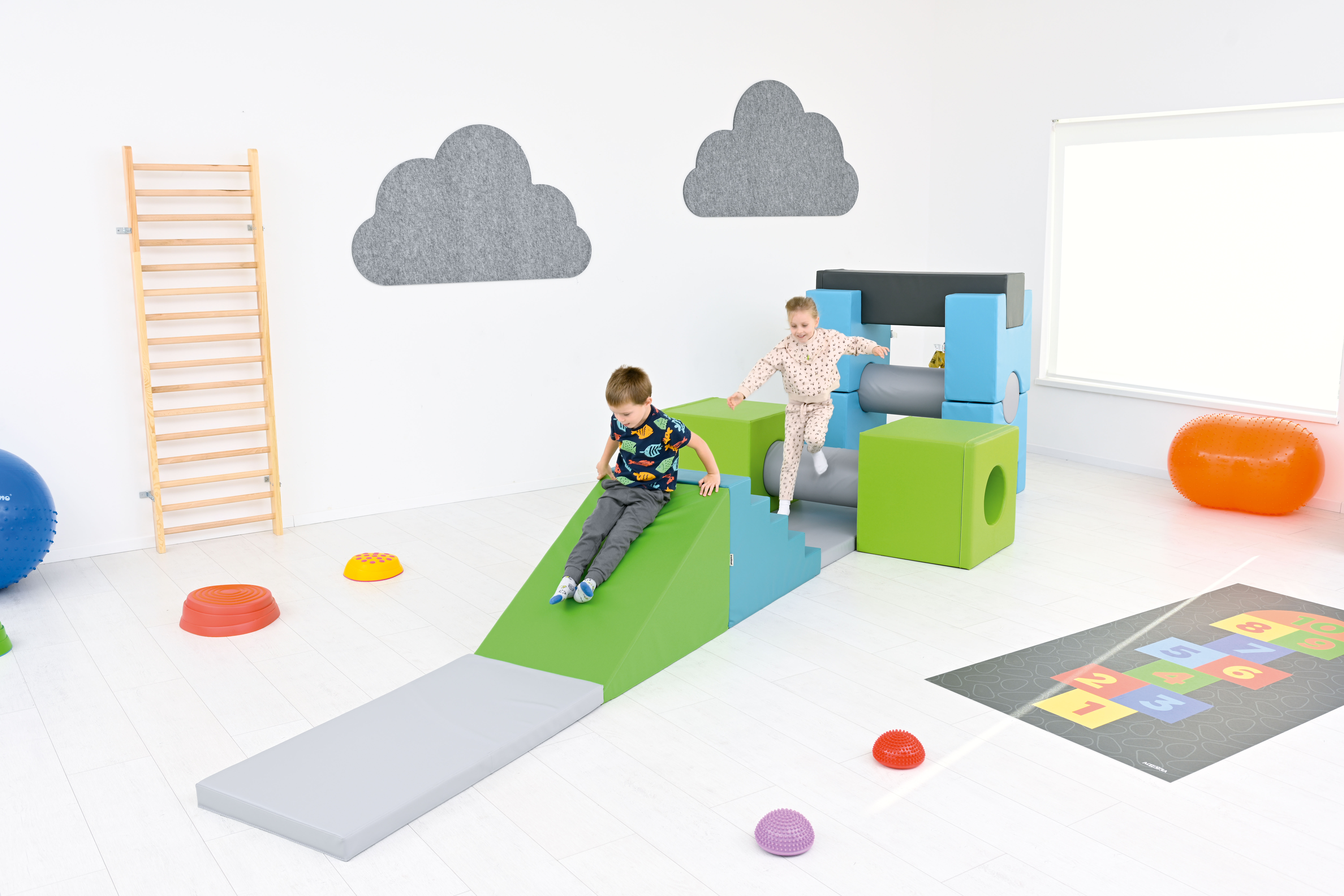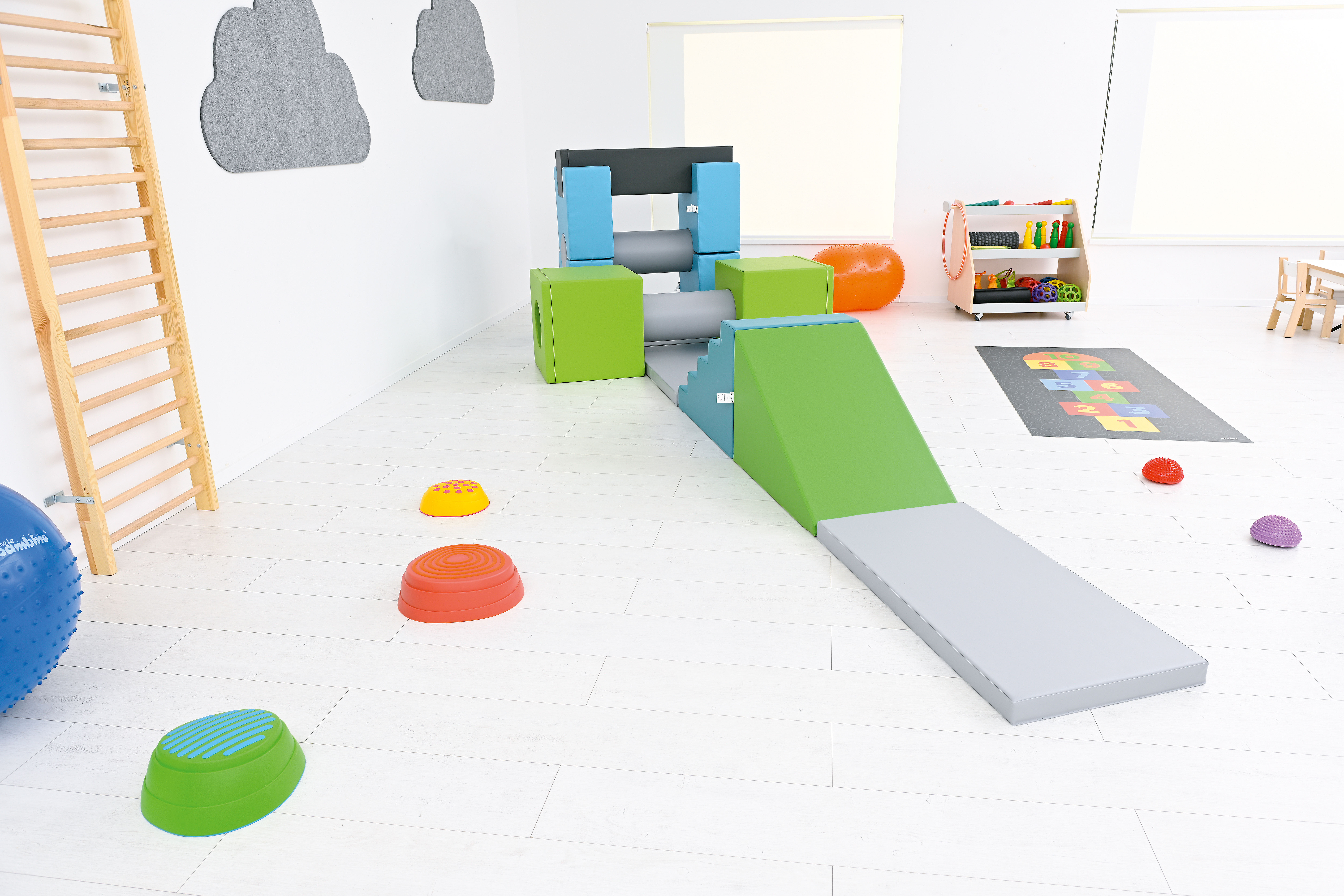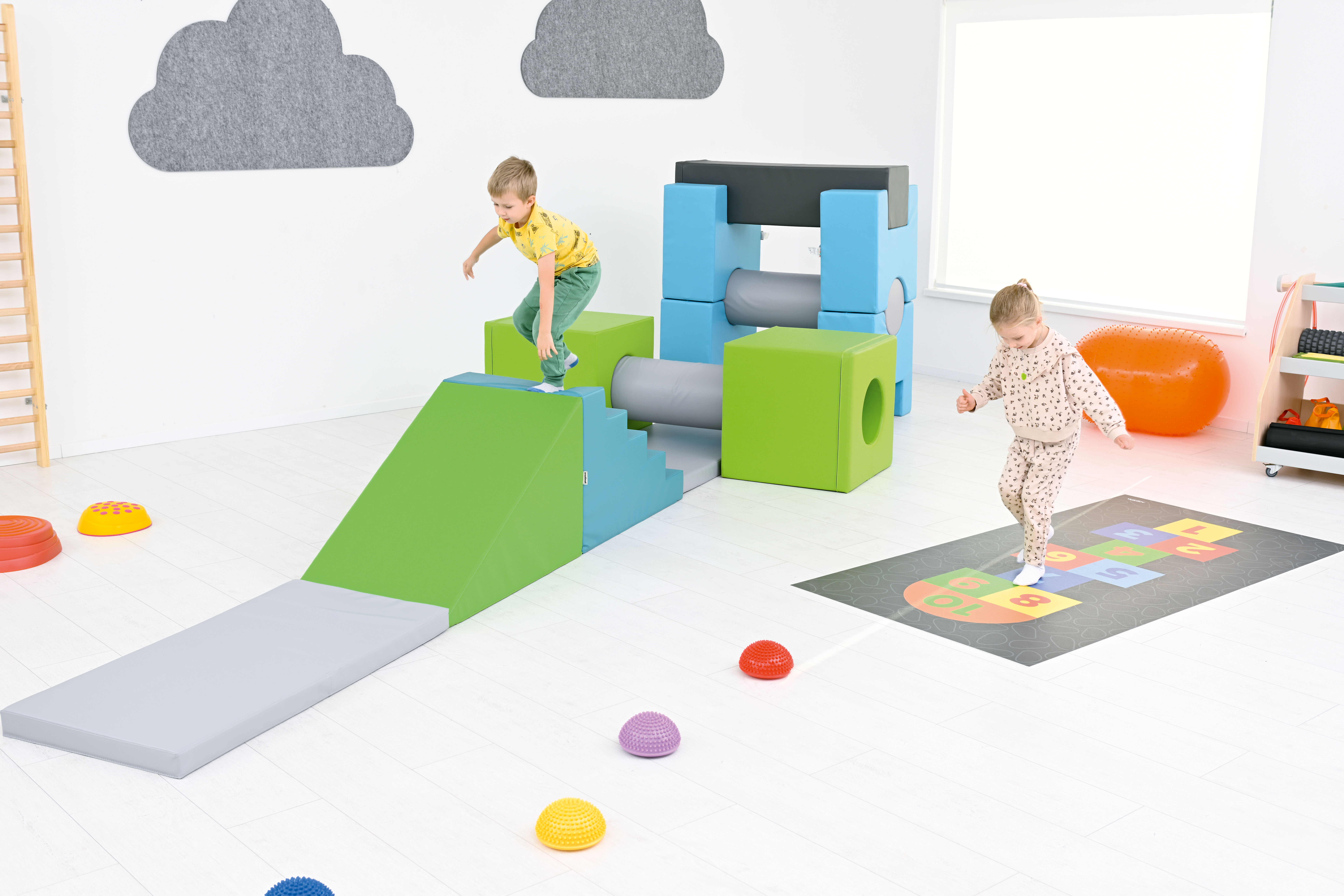 A Híd és átjáró szett egy sokoldalúan használható, habszivacsból készült mozgásfejlesztő eszköz, amely ideális óvodai és fejlesztő intézményi használatra. A szett elemei lehetőséget biztosítanak a gyerekek számára, hogy játékosan fejlesszék egyensúlyérzéküket, koordinációjukat és mozgásbiztonságukat. A különböző formákból – például híd, alagút vagy átjáró – változatos pályák építhetők, így a kreatív mozgásos feladatok könnyen variálhatók. A stabil, mégis puha habanyag biztonságos, a lekerekített élek pedig megelőzik a sérüléseket.