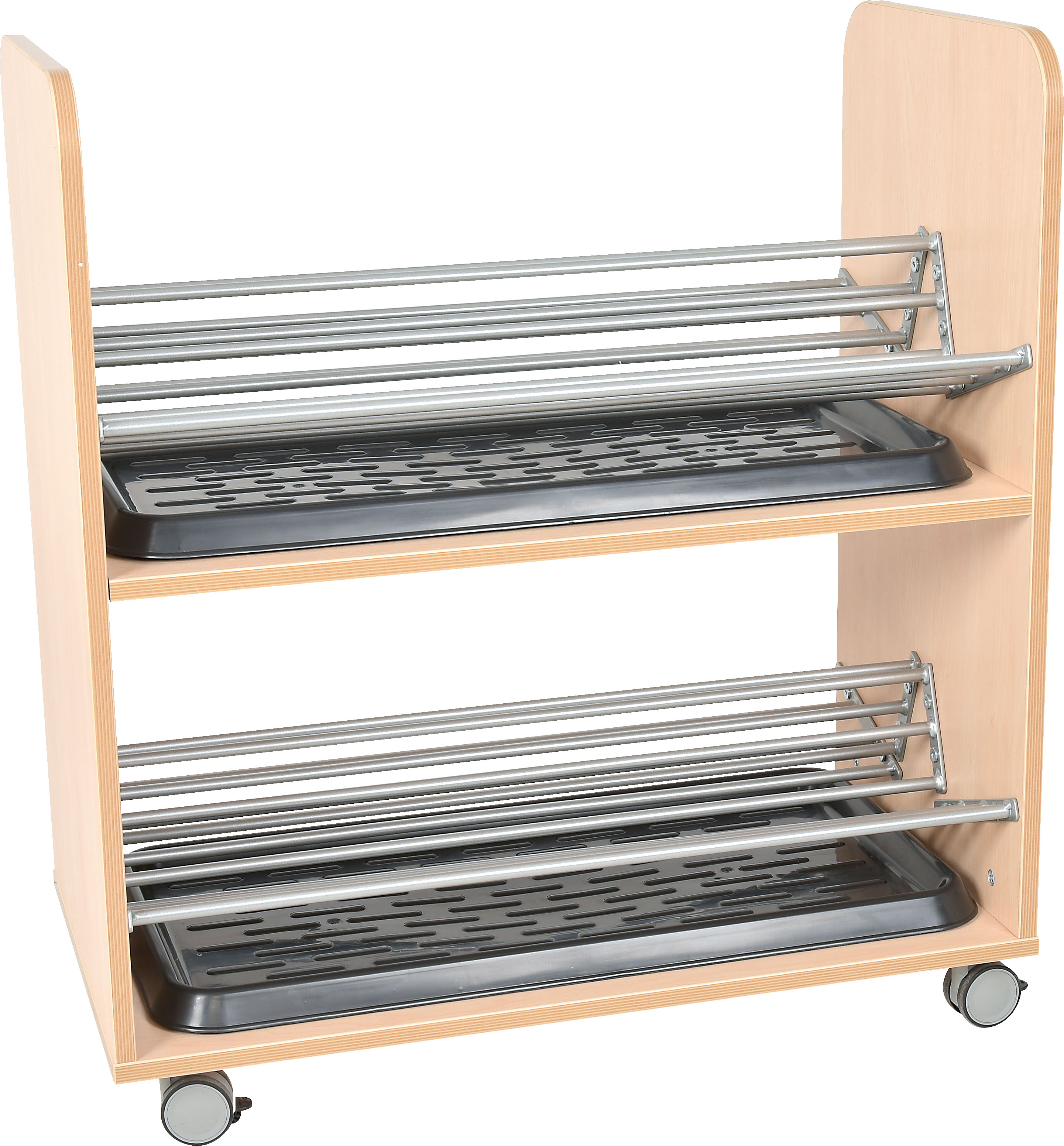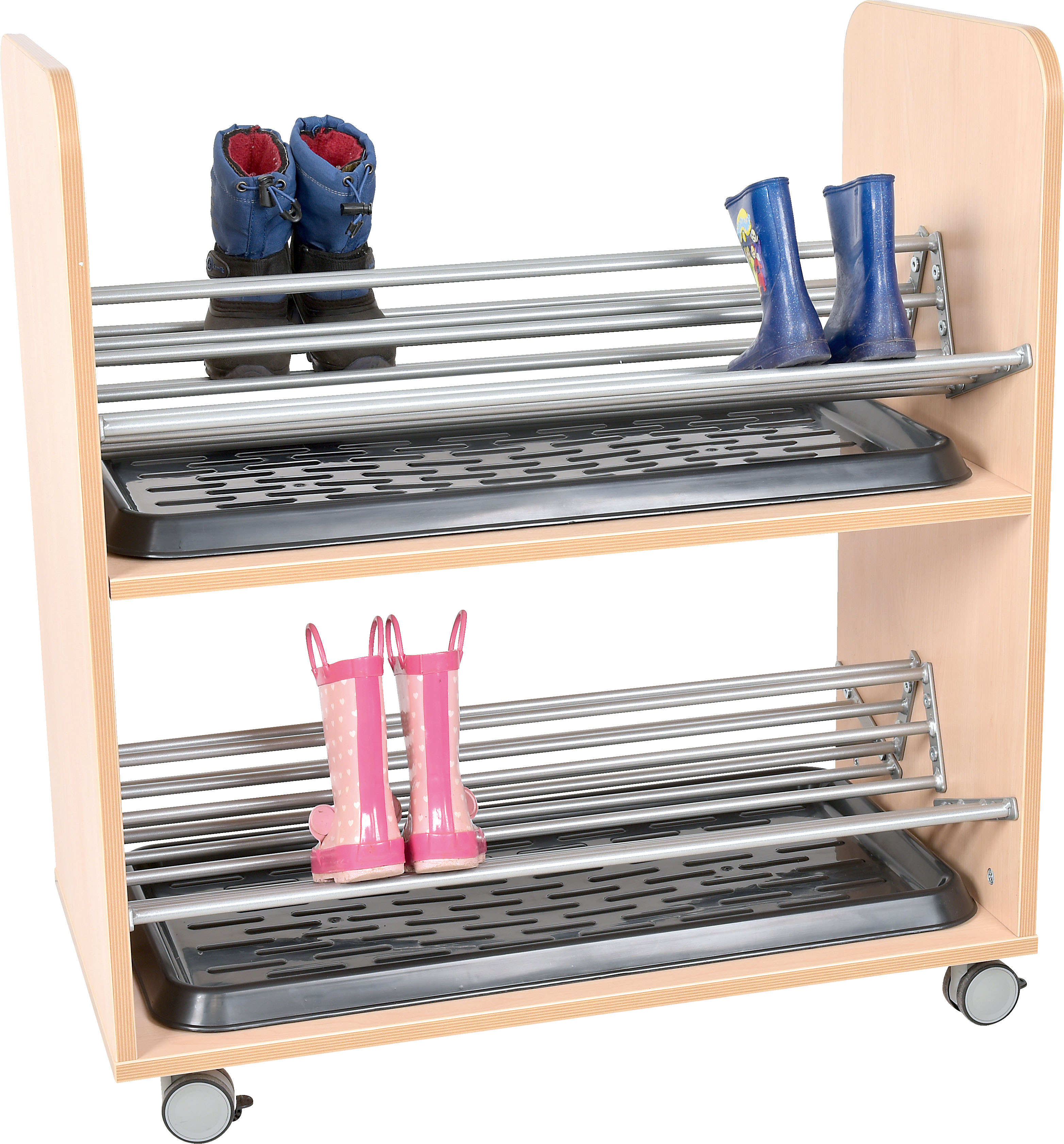 A 80x40x90cm méretű, gurulós kivitelű bútor két polccal rendelkezik, amelyek fém rudakkal és műanyag csepegtető tálcákkal vannak ellátva, így a vizes cipők is biztonságosan elhelyezhetők.