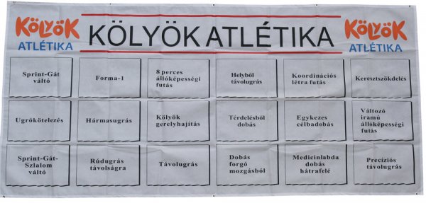 A tábla felső oldala 5, az alsó oldala 2 db felfüggesztő karikával van ellátva. Középen felirat: Kölyök Atlétika. 18 db állomással feliratozva a dokumentációban található feliratokkal.