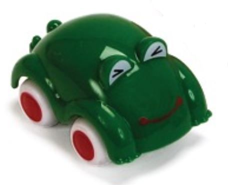 A vidám autók sorozat béka figurás járműve 7 cm méretű, négykerekű, kedves megjelenésű játékautó.