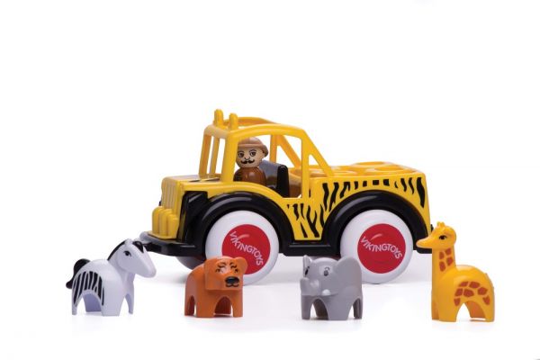 A szafari autó 25 cm méretű, 1 db, a fülkébe rögzíthető figurával és 2 db állattal, zsiráffal és oroszlánnal.