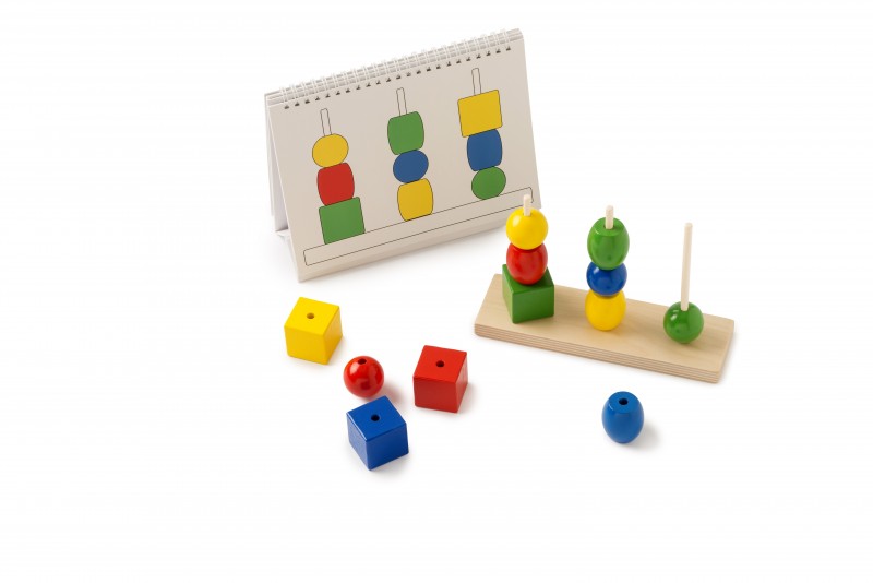 Az állványba állított pálcikákra alkossunk azonos, vagy különböző színű és formájú tornyokat a feladatkártyáknak megfelelően.