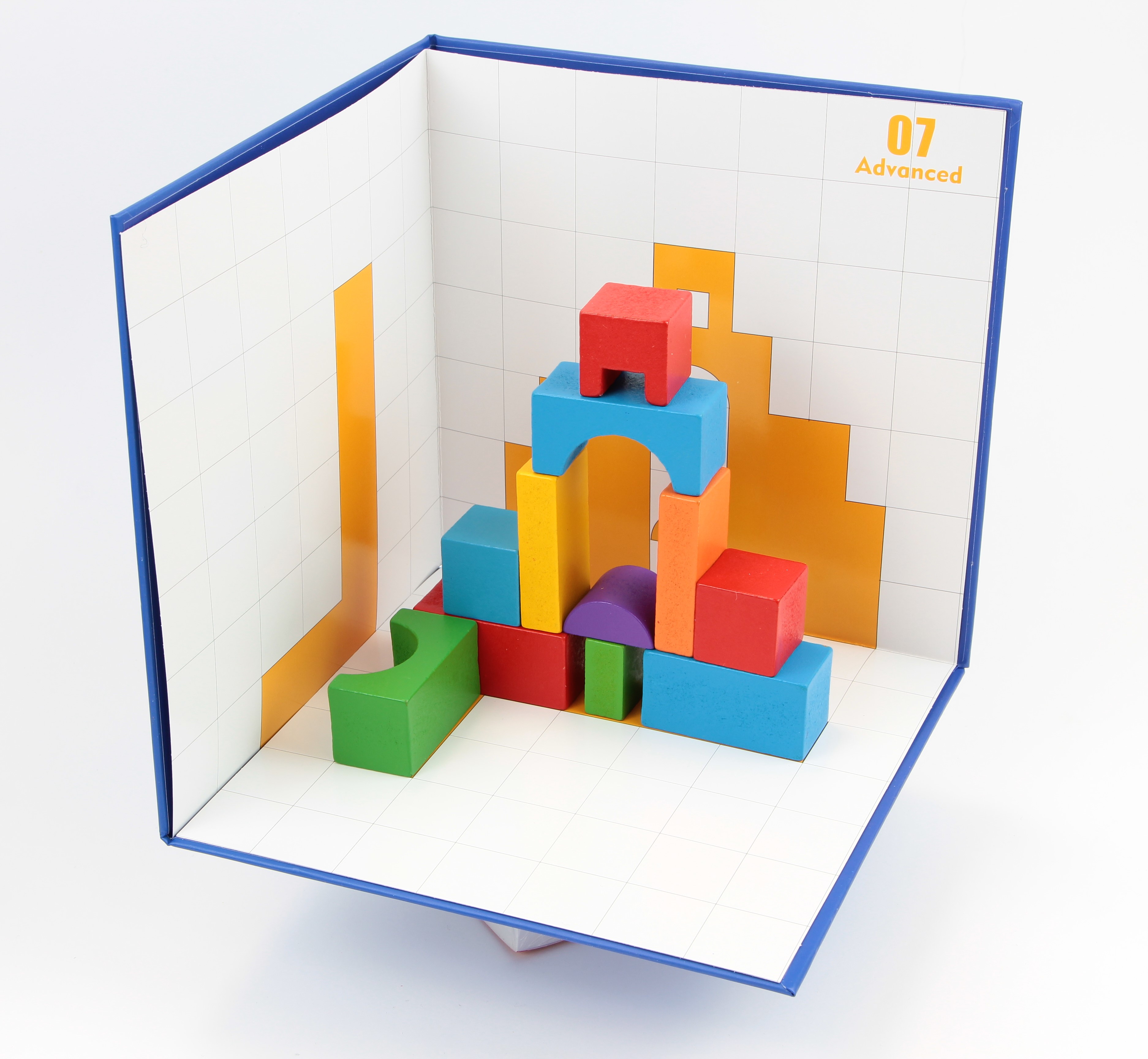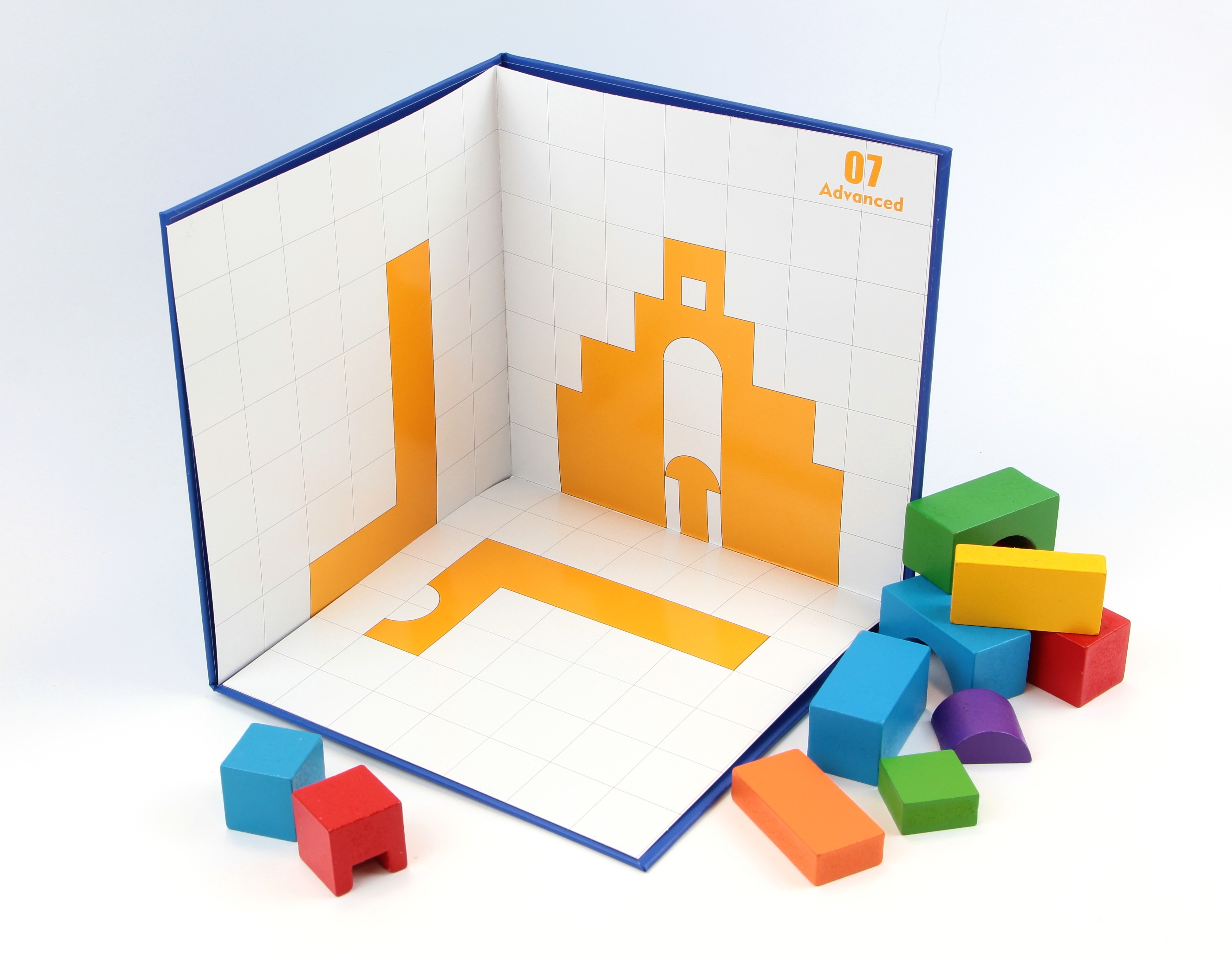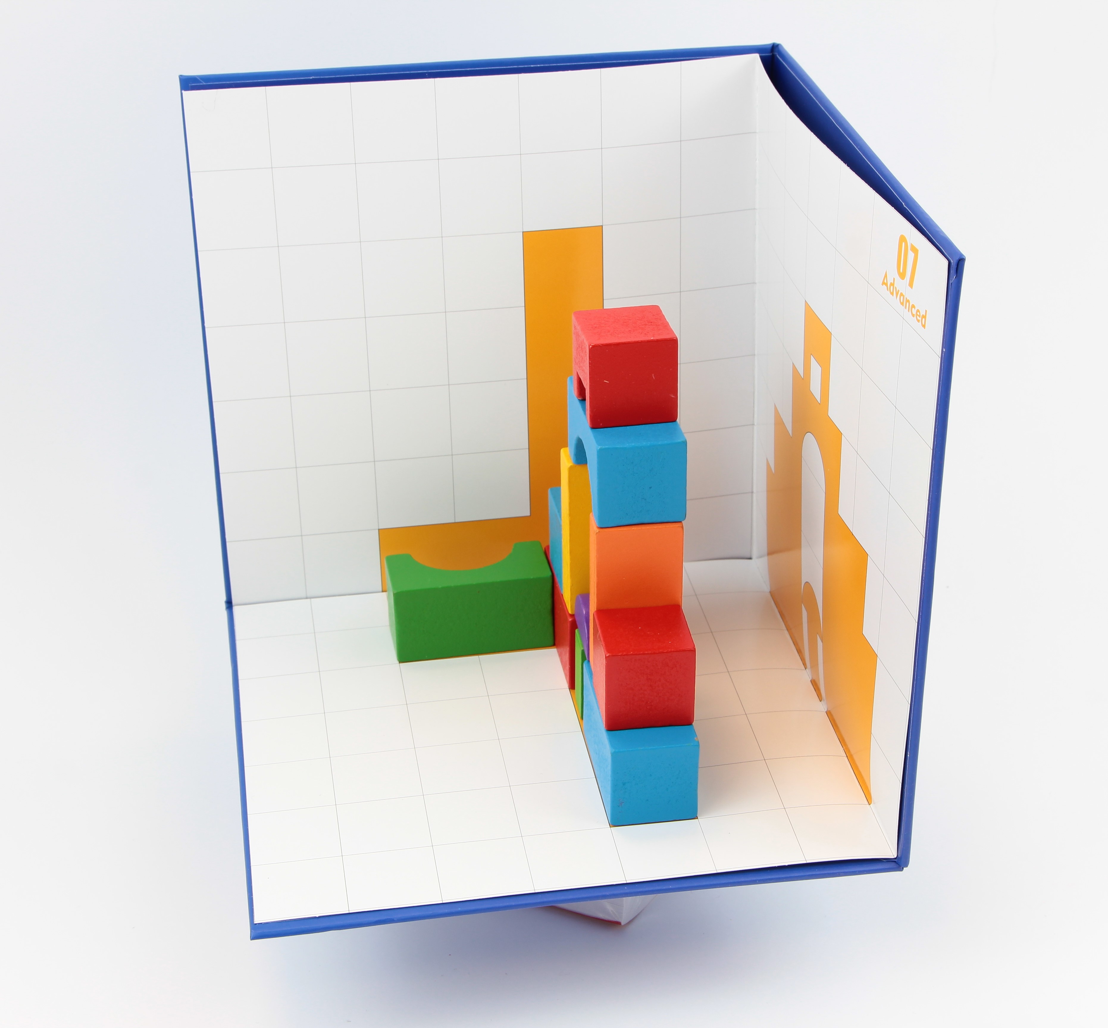 Térbeli logikai építőjáték A készlet tartalma: 1 db vastag karton tartó lap a feladatlapokhoz 3x12 db kétoldalas feladatlap (könnyű, közepes, nehéz) 32 db építőelem (12 különböző forma. 6 különböző szín) 1 db füzet a feladatok megoldásaival