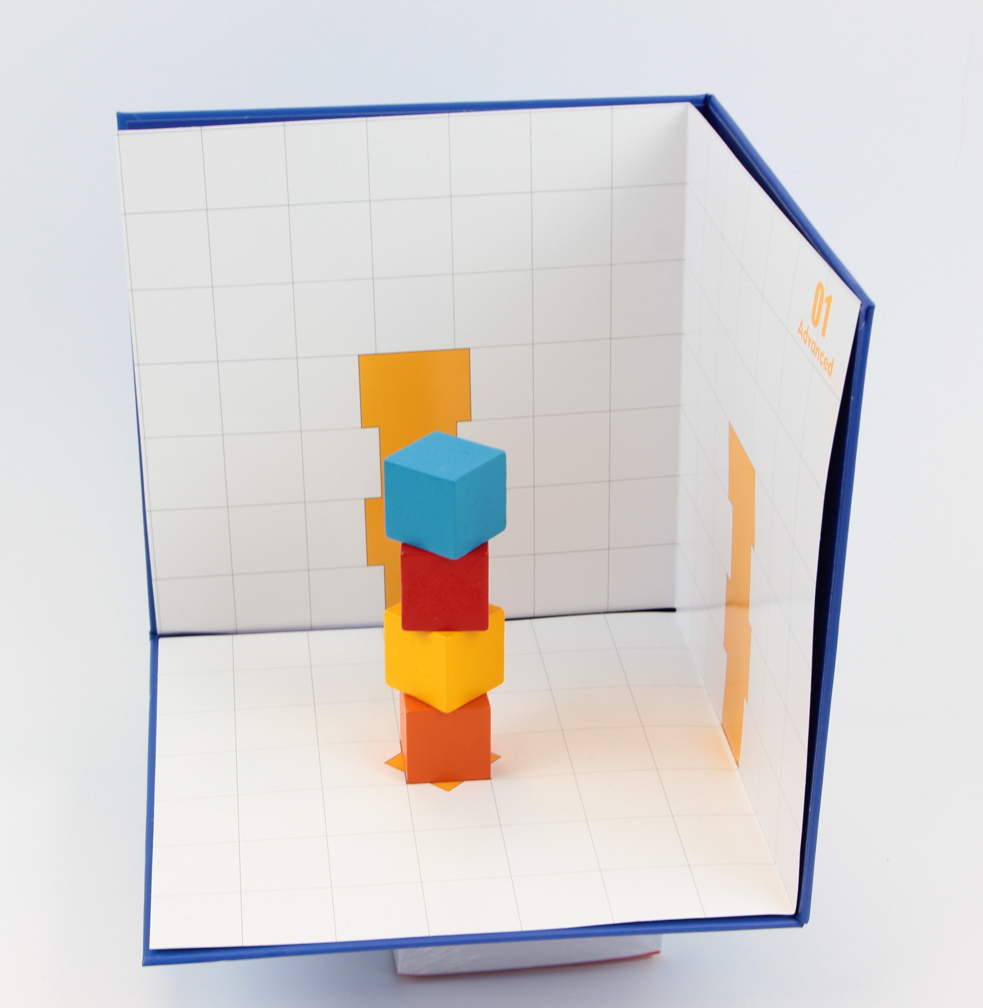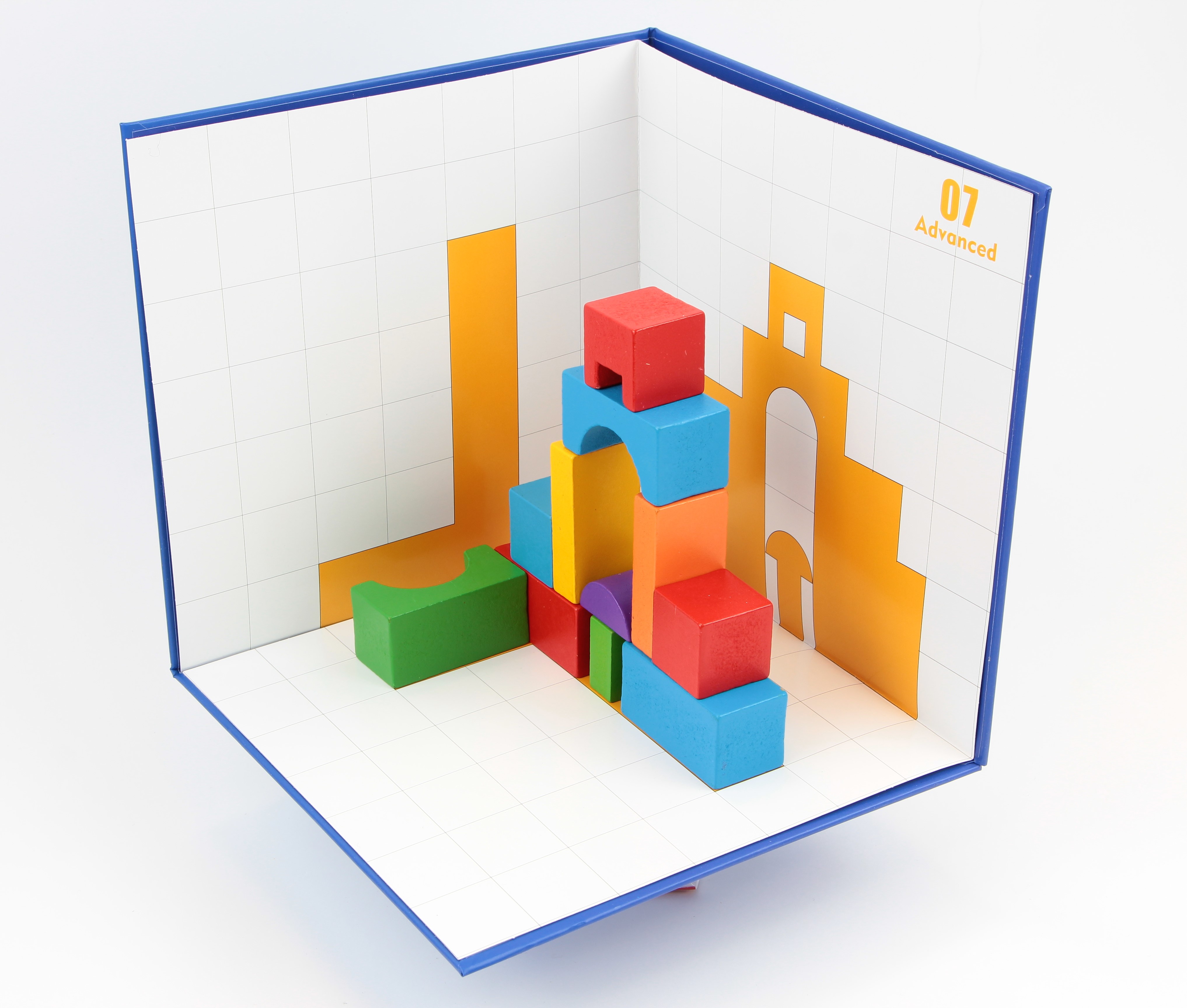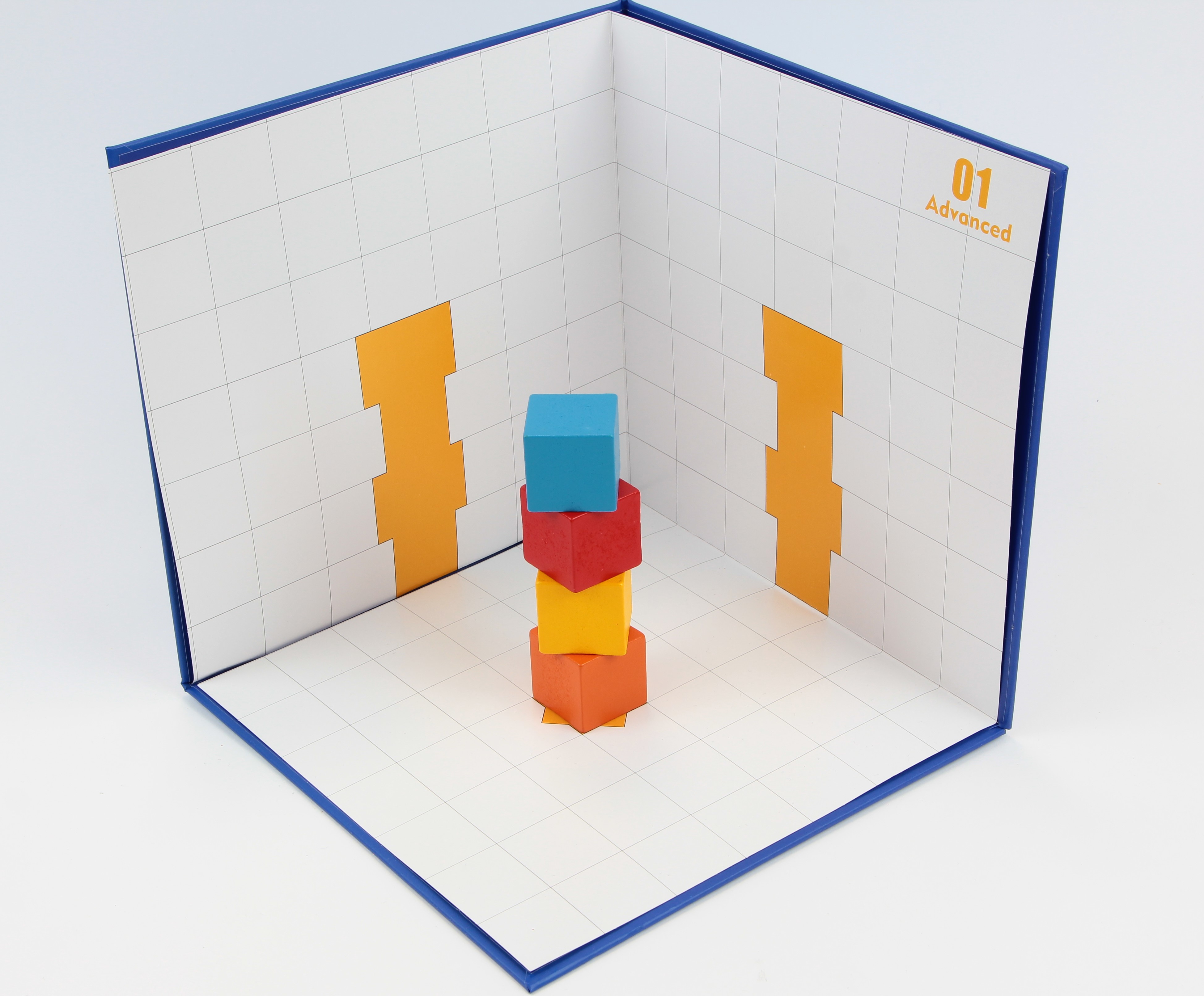 Térbeli logikai építőjáték A készlet tartalma: 1 db vastag karton tartó lap a feladatlapokhoz 3x12 db kétoldalas feladatlap (könnyű, közepes, nehéz) 32 db építőelem (12 különböző forma. 6 különböző szín) 1 db füzet a feladatok megoldásaival