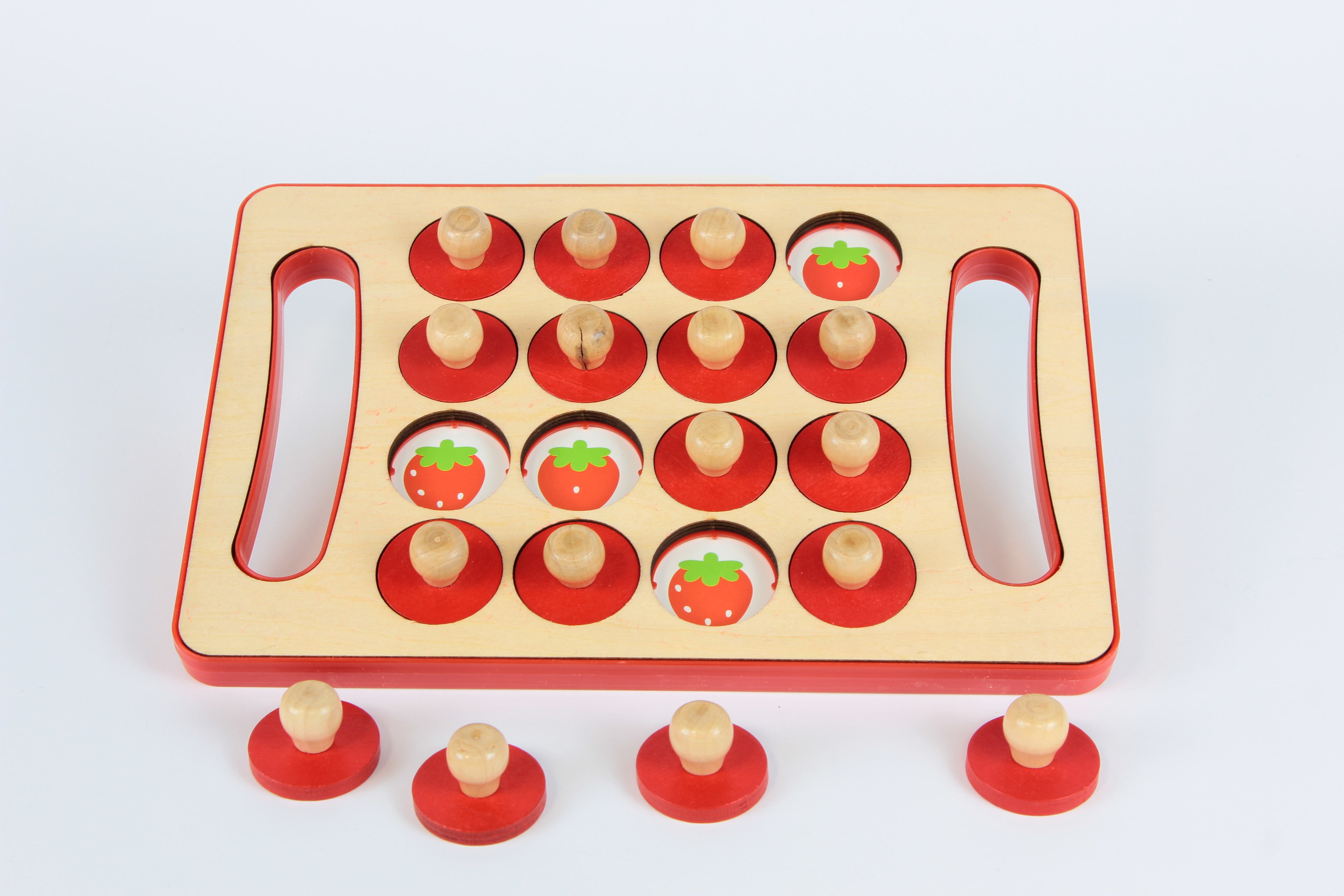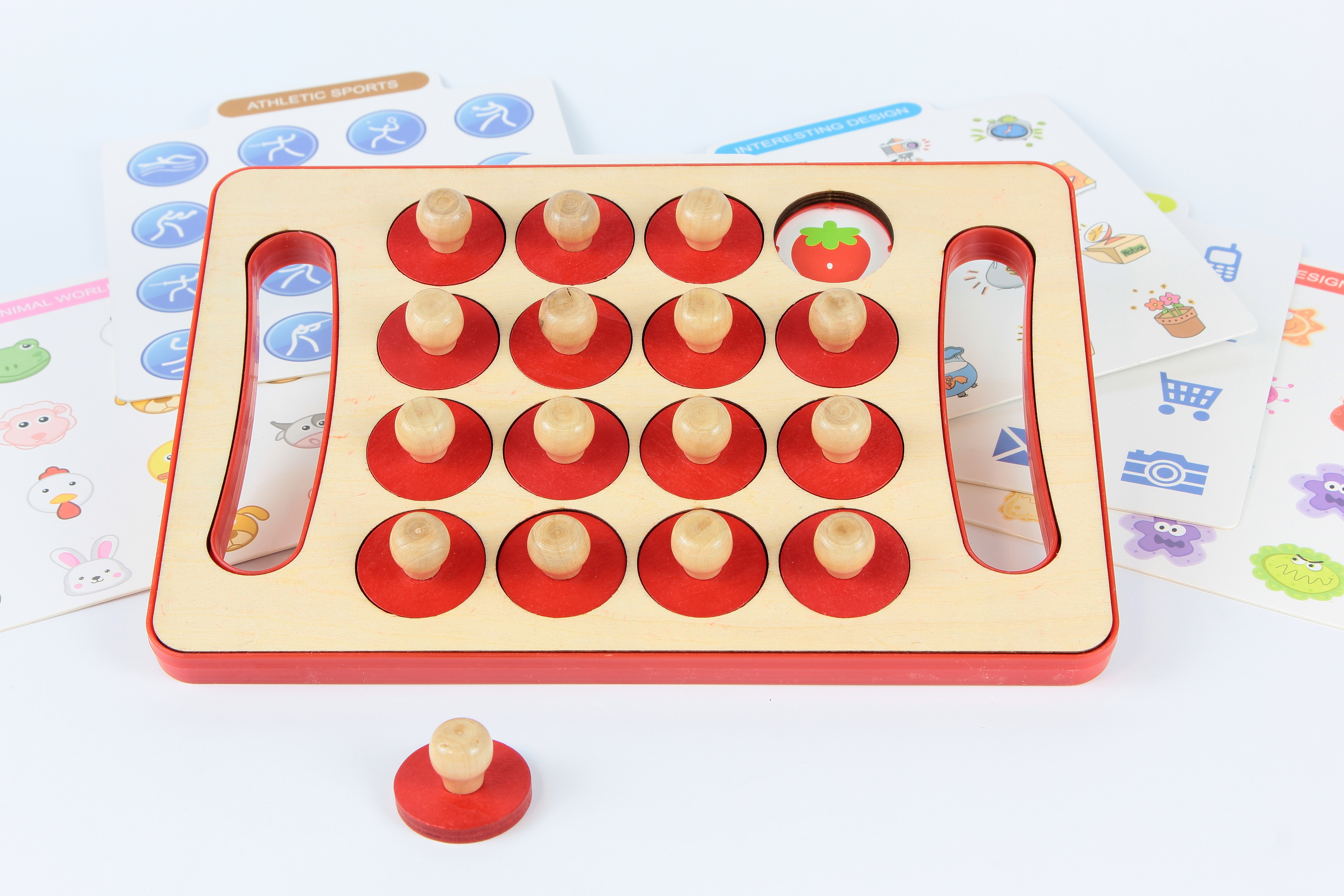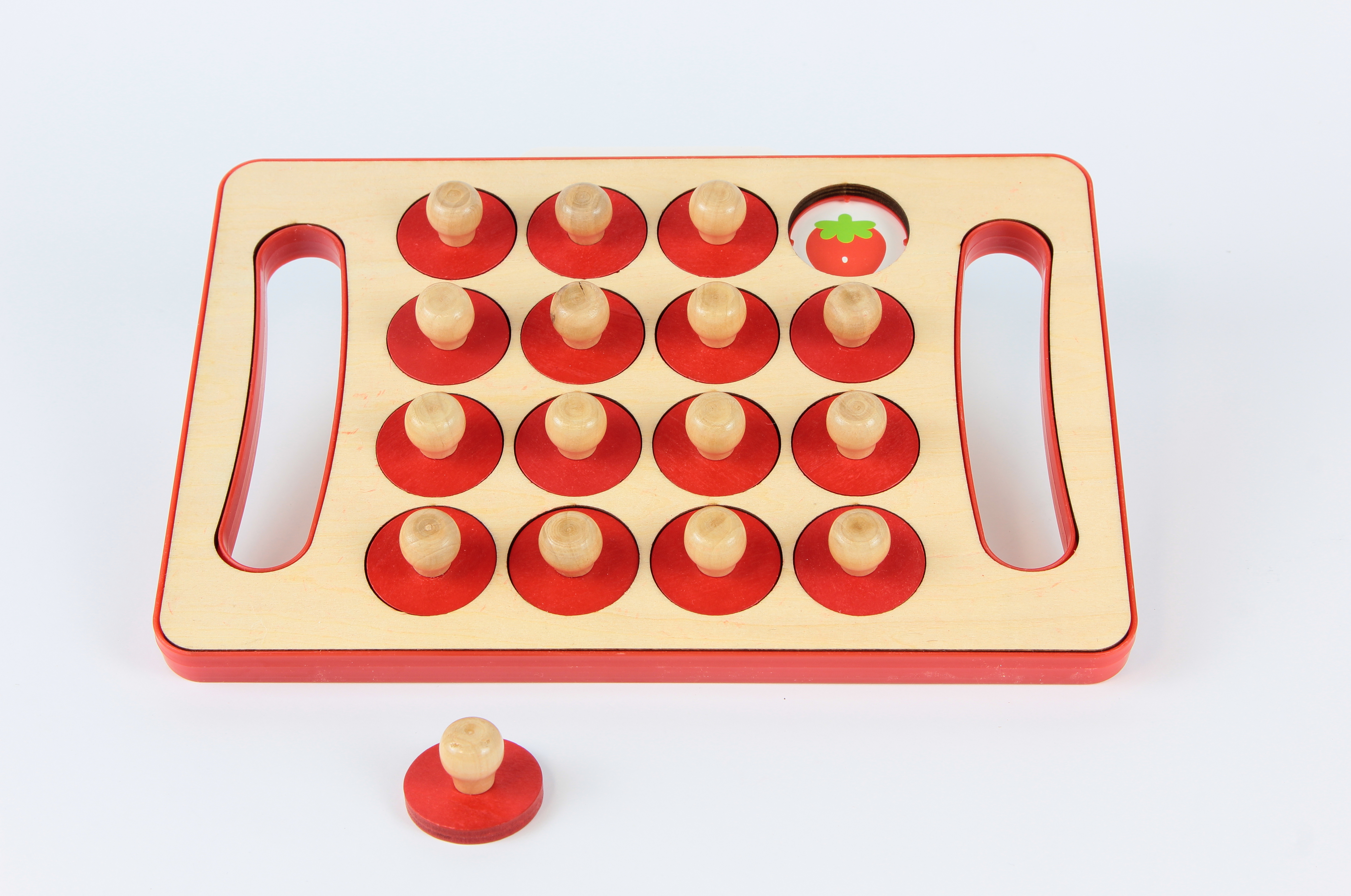 Tartalma: 1 db fa tábla 16 db piros, fogantyús korong 6 db kétoldalas minta- és feladványkártya (gyümölcsök, állatok, sportok, figurák stb.) Az ár 2025.12.31-ig érvényes!