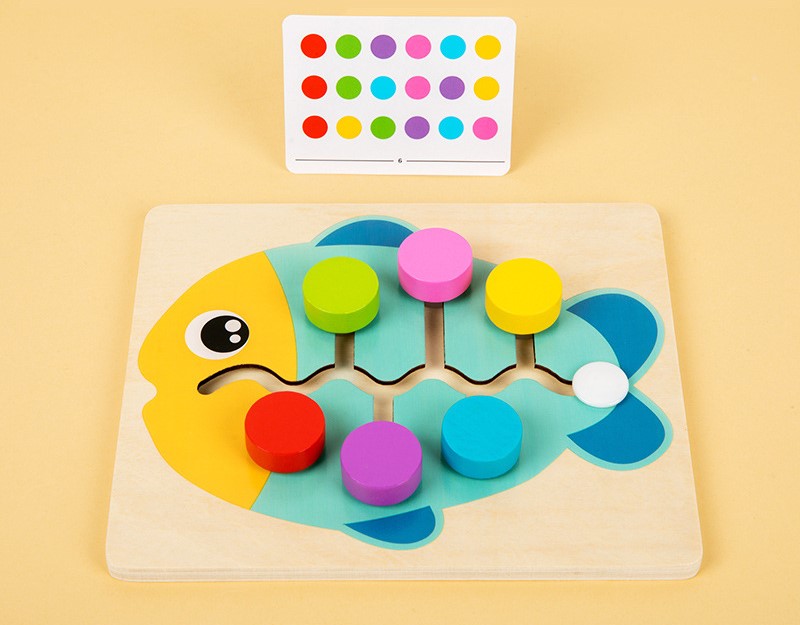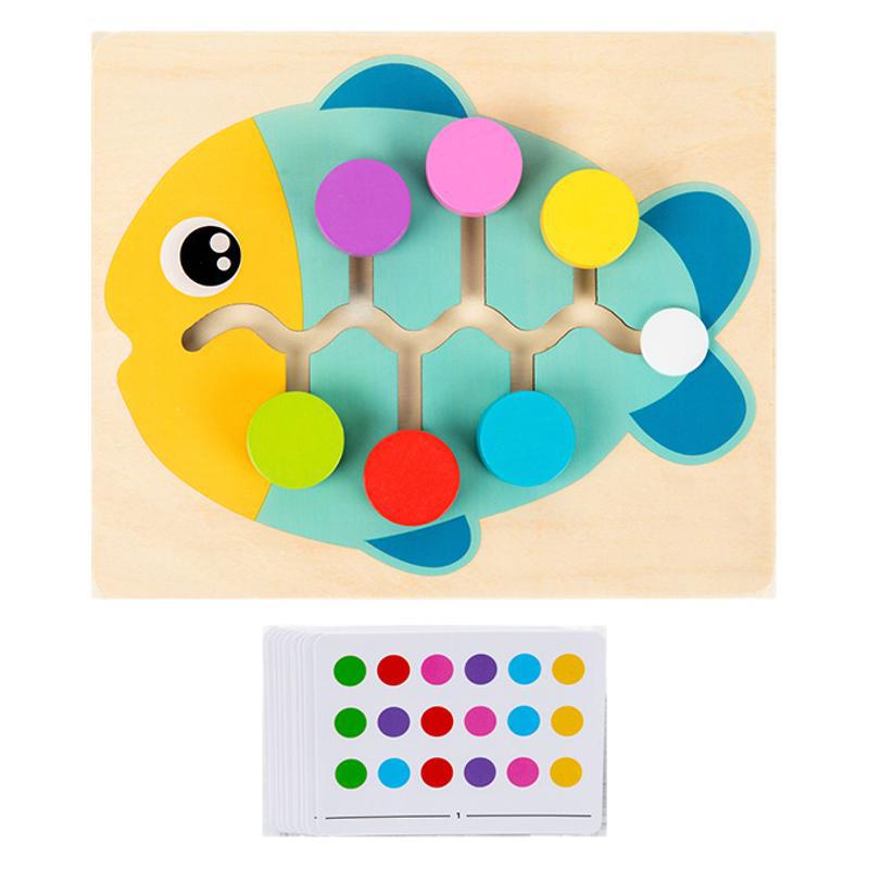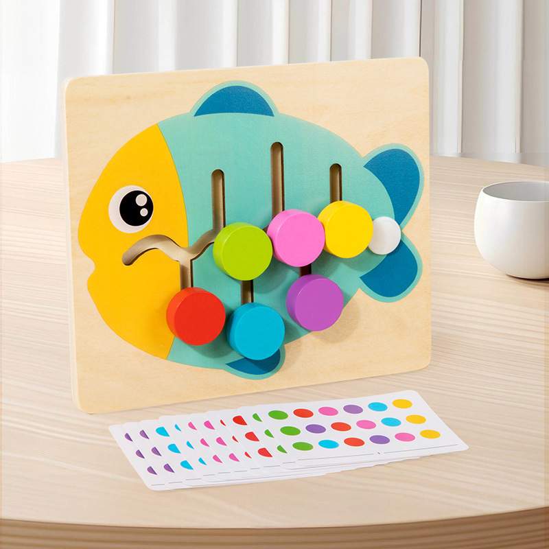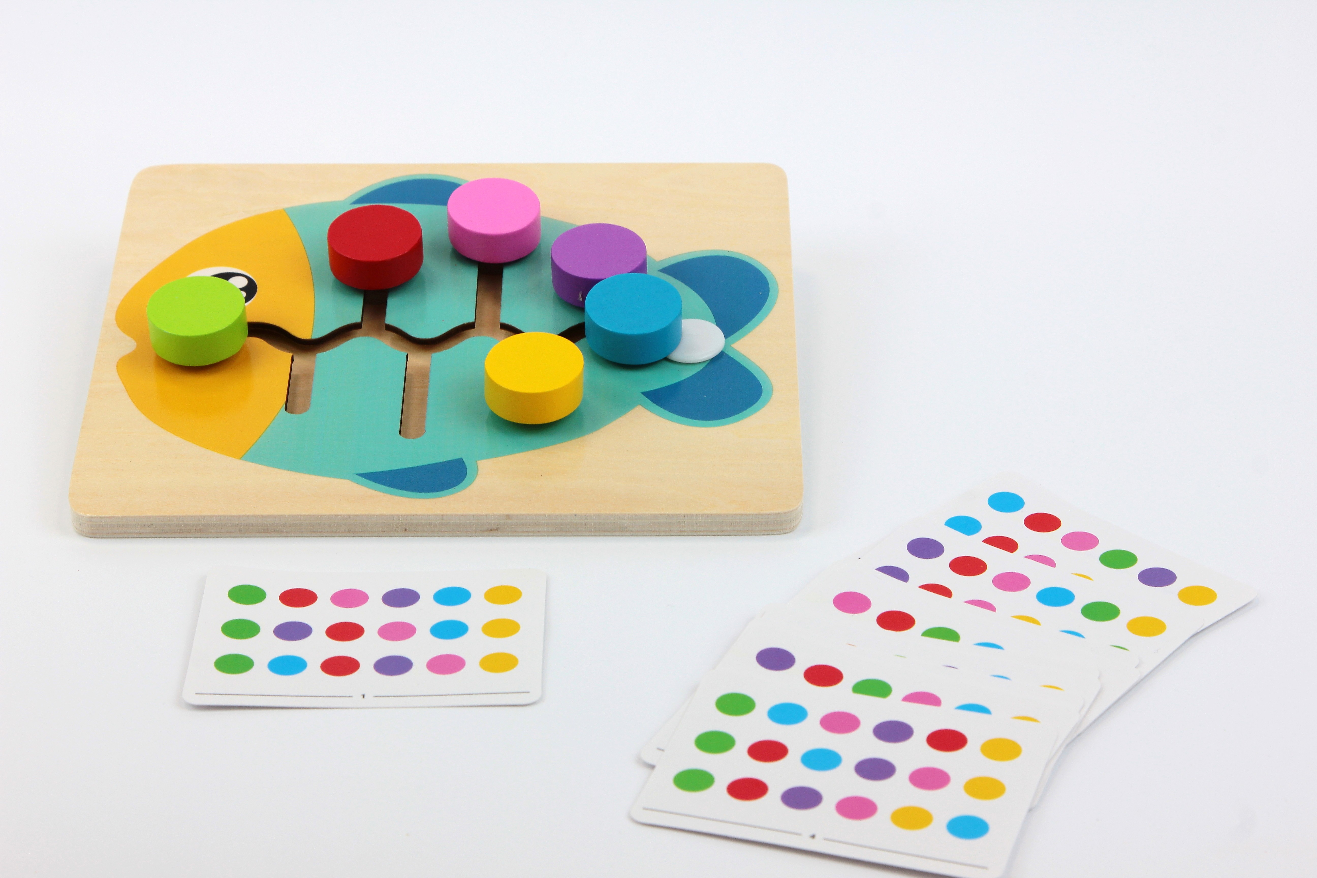 A sorrendiség és színfelismerés játéka Ez a színes halas vonalvezető játék egy kiváló fejlesztőeszköz az óvodás korú gyermekek számára. A cél, hogy a gyermek a színes korongokat a megadott mintakártyák alapján a megfelelő sorrendbe mozgassa a hal testén belül. Tartalma: - 1 db fából készült hal formájú tábla csúsztatható színes korongokkal (zöld, piros, rózsaszín, sárga, kék, lila, sárga) -12 db kétoldalas feladatkártya. oldalanként 3-3 különböző kihívással A gyermek feladata, hogy a korongokat a feladatkártyán látható sorrendben rendezze el – balról jobbra haladva.