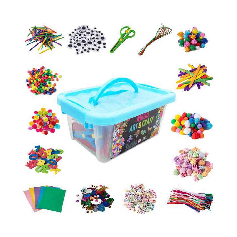 A készlet tartalma: 100 db színes spatula (kb. 11x1 cm) 1 csomag színes fapálca (hosszúság: 4,8 cm) 3 csomag különböző formájú, méretű gyöngy (méretük: kb. 0,5 cm) különböző méretű, műanyag szem (legnagyobb: 1,3 cm átmérőjű) különböző formájú csillogó flitter 1 csomag különböző méretű, színes pompon (legnagyobb: 2,5 cm) 1 csomag különböző méretű, csillogó pompon (legnagyobb: 2,5 cm) 2 csomag színes zsenília (15 cm hosszú) 1 csomag öntapadós, színes dekorgumibetű 1 csomag különböző méretű színes gomb (kb 1-1,5 cm közötti méretek) 5 db különböző színű karton lap (kb. 21x15 cm) 1 db színátmenetes, vékony gumikötél (180 cm) 1 db olló (13,5 cm nagyságú) A készlet praktikus, hordozható műanyag dobozban érkezik, kapcsos záródással. Csomagolási mérete: 26x19x12 cm.