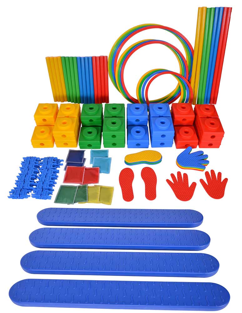 A készlet építőkockákból, csövekből, babzsákokból és további kiegészítőkből áll, amelyek hatékonyan támogatják a mozgáskoordináció fejlesztését. Különböző korcsoportok számára is ideális, számos mozgásfejlesztő gyakorlat elvégzéséhez tökéletesen alkalmas. A készlet tartalma: 12 db féltégla, 8 db tégla, 4 db egyensúlyozó deszka, 4 db 35 cm-es karika, 4 db 50 cm-es karika, 4 db 60 cm-es karika, 16 db 35 cm-es rúd, 8 db 70 cm-es rúd, 12 db rúd és karika rögzítő kapocs, 12 db kapocs rudak összekapcsolásához, 10 db babzsák, 5 pár kéznyom, 5 pár lábnyom.