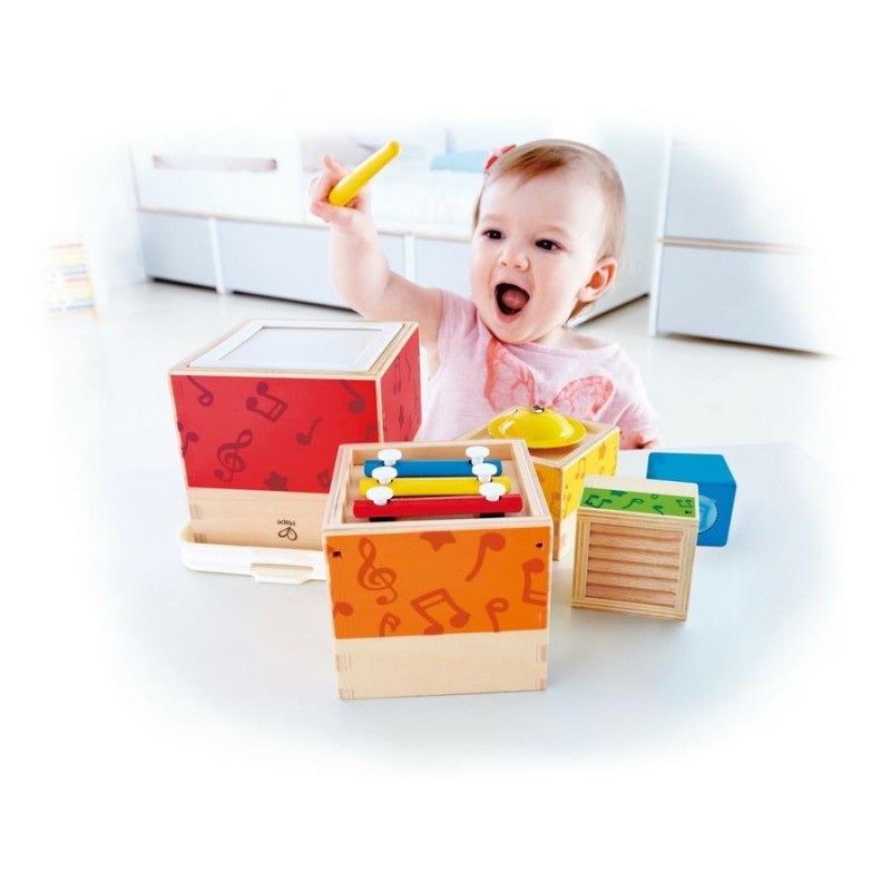Hape Hangszertorony 18 hó+ A termék mérete egymásba rakva: 12,5x14x12,5 cm A doboz mérete: 15x25,5x24 cm A készlet tartalma 5 különböző méretű fadoboz, melyekkel különböző hangok szólaltathatóak meg. 1 db dob (rugalmas, gumi-szerű felülettel) 1 db 3 hangúxilofon 1 db a dobozra rögzített cintányér 1 db guiro 1 db csörgő kocka 1 db dobverő A dobozok egymásba rakhatók. A legnagyobb méretű dobozon egy hordozó fül is található, melyre a dobverő rögzíthető. 18 hónapos korú gyermekek használatára CE minősítéssel ellátva! Ajánlott korosztály: 18 – 36 Hónap