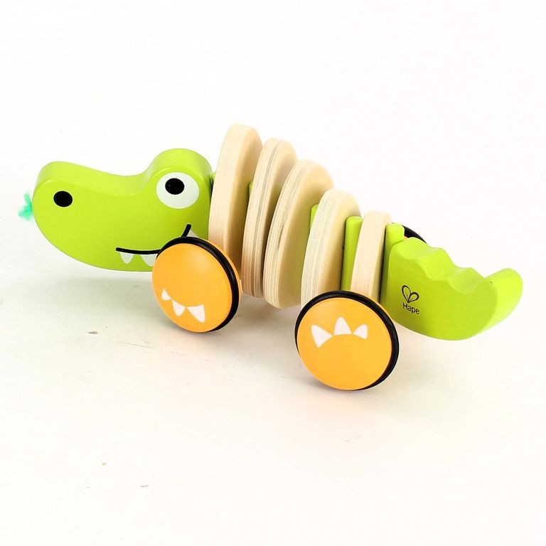 Hape Húzós Krokodil - 12 hó+ A doboz mérete: 15,5x26x18 cm A termék mérete: 29x10x11 cm Húzható, 4 keréken guruló krokodil. Fejétől a tarkáig testének minden eleme (m db test elem, 6 db gerinc elem)el tud mozdulni, emiatt vicces kígyózó mozgása van, miközben a gyermek maga után húzza. Narancs kerekein, fehér minták láthatók. Kerekei gumival burkoltak, ezért csendesen gurulnak. 12 hónapos korú gyermekek használatára CE minősítéssel ellátva! Ajánlott korosztály: 12 – 36 Hónap