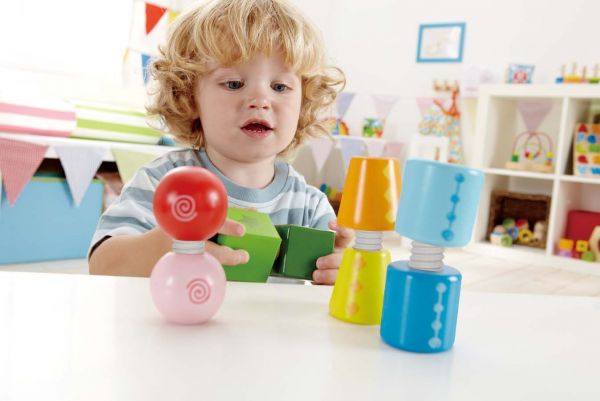 Hape Csavarj és forgass el! - 24 hó+ A doboz mérete: 18x18x6 cm Az elemek mérete: 5 cm 8 darabos finommotorikát fejlesztő készlet. A formák négyszögletes, kúpos és gömb alakúak. Kettesével és hármasával is össze lehet csavarni az elemeket. 24 hónapos korú gyermekek használatára CE minősítéssel ellátva! Ajánlott korosztály: 2 – 4 Év