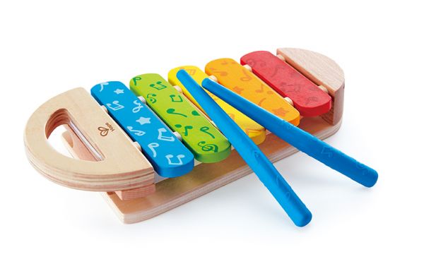 Hape Xylophone 10 hó+ A termék mérete: 27,5x14x4,5 cm Ezzel a szivárvány színűxilofonnal új hangokat és színeket ismerhetnek meg a legkisebbek. fából, az ütők műanyagból készültek. Minden sáv más-más hangot ad, ha megszólaltatjuk az ütőkkel. A pentaton hangsor elemei rugalmasan vannak rögzítve a fogantyúval ellátott keretbe. A zenélés után a két ütőt a xilofon alján lévő tartókban lehet rögzíteni. 10 hónapos korú gyermekek használatára CE minősítéssel ellátva! Ajánlott korosztály: 10 – 36 Hónap
