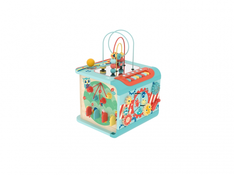 A kocka tetején egy vonalvezető labirintus található piros, sárga és kék útvonalakkal. Az a feladat, hogy a különböző színű golyókat a kicsik eljuttassák a pálya egyik végéből a másikba. A vonalvezető mellett egy gólyókalapáló kapott helyet. A másik oldalon pedig egy 8 billentyűs hangszer található, amely 5 különböző zenei módot tud lejátszani.