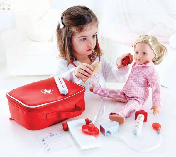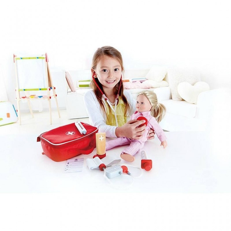 Ebben a doktor táskában mindent megtalálsz, amire egy kis doktornak szüksége lehet. Vizsgáld meg a családtagjaidat, vagy az óvodás társaidat, mondd el a diagnózist, írd fel a receptet, gyógyítsd meg a betegeket. Szerepjáték gyakorlásában nélkülözhetetlen eszköz. A képeken látható játékbabát a készlet nem tartalmazza!