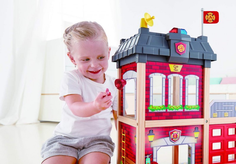 Ha egy ilyen tűzoltó állomás van a közelben, akkor minden katasztrófa helyzet könnyen elhárítható. Amikor megszólal a riasztó csengő, a tűzoltóautóval, vagy a helikopterrel hamar a helyszínre sietnek a lánglovagok. Akárcsak a filmeken, itt is az állomáshoz tartozik egy dalmata kutyus. A 13 darabos készlettel szuper kalandokat játszhat el minden kis tűzoltó. Tartalma: 1 db szirénázó tűzoltóállomás, 1 db forgatható, emelhető létrájú tűzoltóautó 1 db tűzoltó helikopter 1 db tűzoltó figura, melynek kezébe illeszthetőek a tűzoltó eszközök 1 db dalmata kutyus 1 db szekerce 1 db poroltó 1 db tűzcsap 1 db tűz 1 db mentés irányító pult Az épület tetején parabola antenna és az állomás zászlaja is kirakható. Az emeleten egy kis csengő kapott helyet, Ha megszólal, máris kiállhat a garázsból az autó. Nagyon menő kelléke lehet egy fiús gyerekszobának. Kiváló minőségű fa alapanyagokból készült, vizes bázisú, nem toxikus festékkel díszítve, műanyag kiegészítőkkel.
