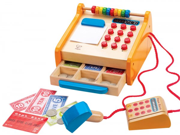 Kártya vagy készpénz? Te melyiket használod szívesebben? Mi a boltban mindenre fel vagyunk készülve! Ezt a fából készült pénztárgépet a boltos-vásárlós játékokhoz nagyszerűen használhatod. A vonalkód- és kártyaleolvasó mellett még sok játékpénzt és bankkártyát is tartalmaz a készlet.