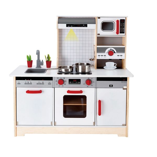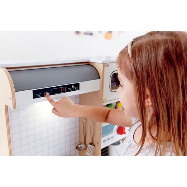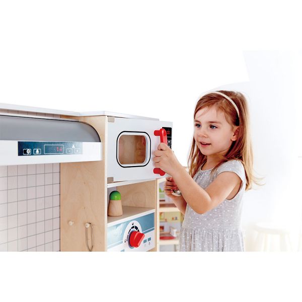 A kicsik ebben a konyhában mindent megtalálnak, ami egy igazán önfeledt és vidám játékhoz szükséges. A játék a legmodernebb konyhai eszközökkel van felszerelve, ezáltal a legélethűbb főzés élményét nyújtja a gyerekeknek. A hűtőszekrényben tárolhatjuk a finomságokat, míg neki nem látunk az elkészítésüknek. A mikrohullámú sütő csilingel, ha megmelegedett benne az étel, a szagelszívó világít. A sütőben finom sültek készíthetők és a maszatos edényeket utána el lehet tisztítani a tűzhely melletti mosogatóban, de akár a mosogatógépben is. Ebéd után pedig egy jó kávéval is meg lehet kínálni a vendégeket. A terméket lapra szerelten szállítjuk. A Hape, mint környezettudatos cég, törekszik arra, hogy a kiváló minőségű fajátékok, fenntartható, újra megújuló erdőkből kerüljenek ki.