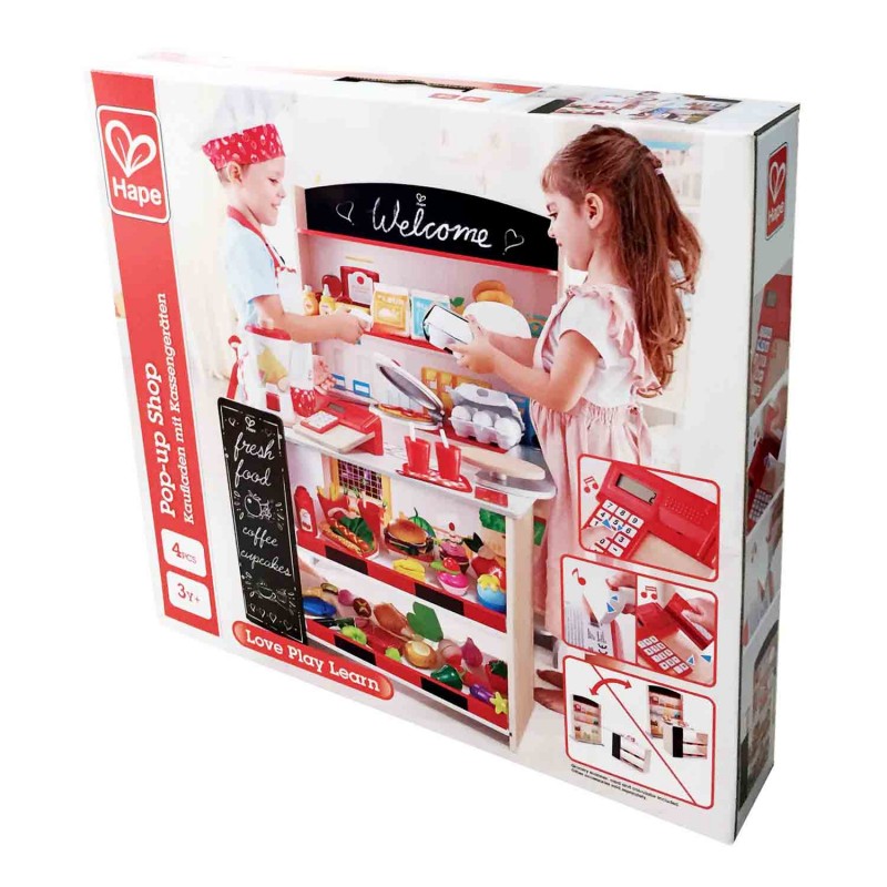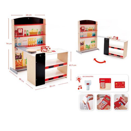Hape Elárusító pult pénztárgéppel és vonalkód leolvasóval A doboz mérete: 64x11x60 cm A termék mérete: 64x88x94 cm A szekrény tetején és a pult egyik oldalán krétával írható táblák vannak. A szekrény 4 polcos, a pult 2 polcos, melyeket egy plusz pult elem köt össze. Többféleképpen is egymás mellé lehet rakni a bútorokat, ahogy a legpraktikusabb az elrendezés. A készlet tartalmaz még egy kézi szkennert is, amely sípol és villog, amikor a hátoldalán található gombot megnyomjuk. A pénztárgép a megvásárolt termékek árának összesítéséhez használható, majd pedig a fizetéshez a bankkártya terminál. 4 darabos készlet, mely a boltos szerepjátékok remek kiegészítője lehet. Ajánlott korosztály: 3 – 8 Év