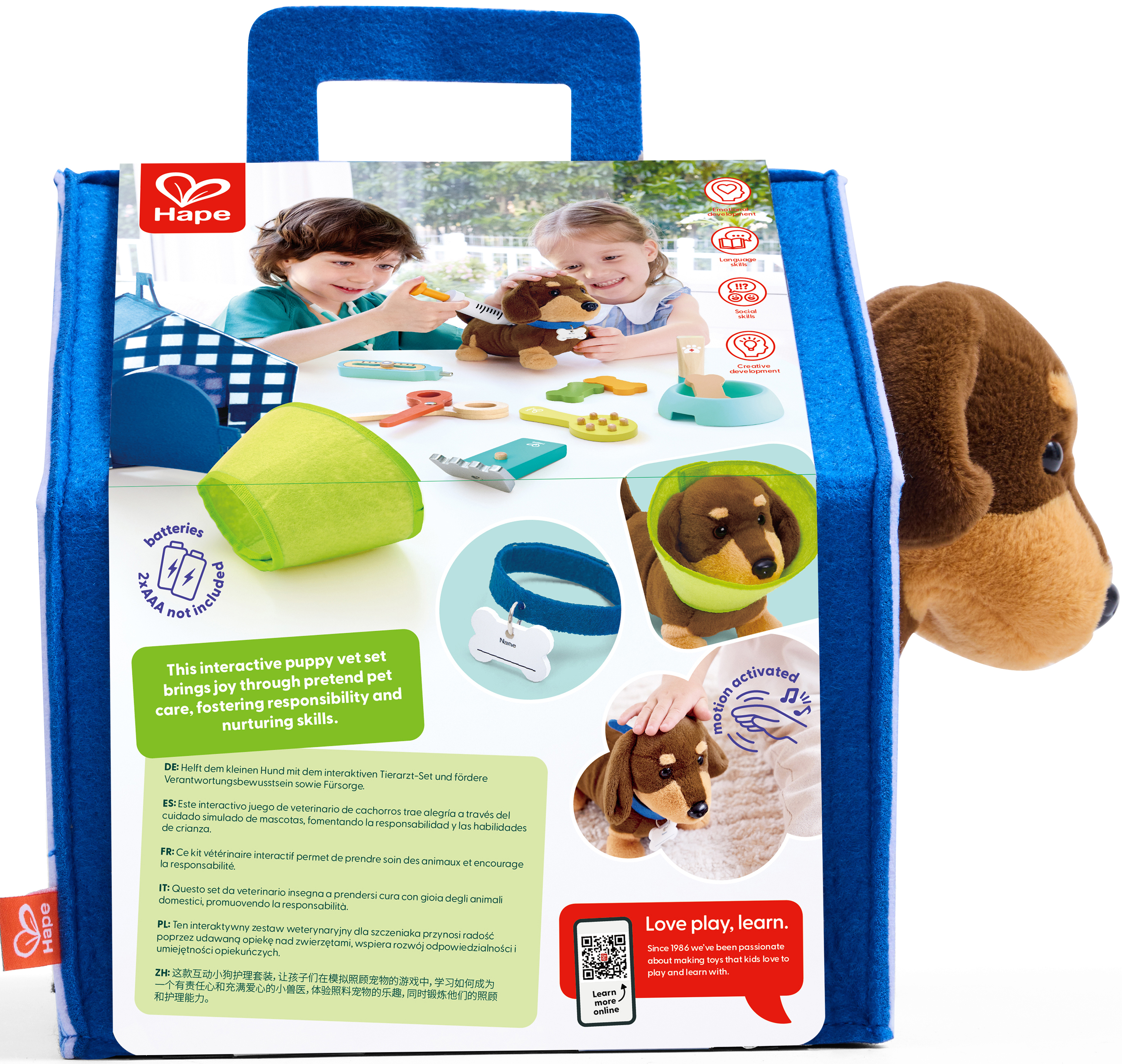 Buksi állatorvosi készlet, kiskutyával A 16 darabos szett tartalma: 1 db hordozható kutyaház, 1 db kiskutya, 1 db sztetoszkóp, 1 db mozgatható, fából készült fecskendő, 1 db kenőcs-ecsetelő, 1 db trimmelő, 1 db olló, 1, db kefe, 1 db mozgatható hőmérséklet jelzős hőmérő, 1 db tálka, 3 db csont, 1 db tépőzáras nyakörv, feiratozható névtáblával, 1 db tépőzáras gallér A kutyaház mérete: 19x22x20 cm Ez a színes állatorvosi készlet szórakoztató és oktató módon segíti a gyerekeket abban, hogy megismerkedjenek az állatgondozással, miközben a felelősségérzetet és empátiát is megtanulják. A szettben lévő kiskutya elemmel működik, amely valósághű hangokkal reagál, ha megérintjük a fejét, így valódi szerepjáték élményt nyújt. Ajánlott korosztály: 3 – 8 Év